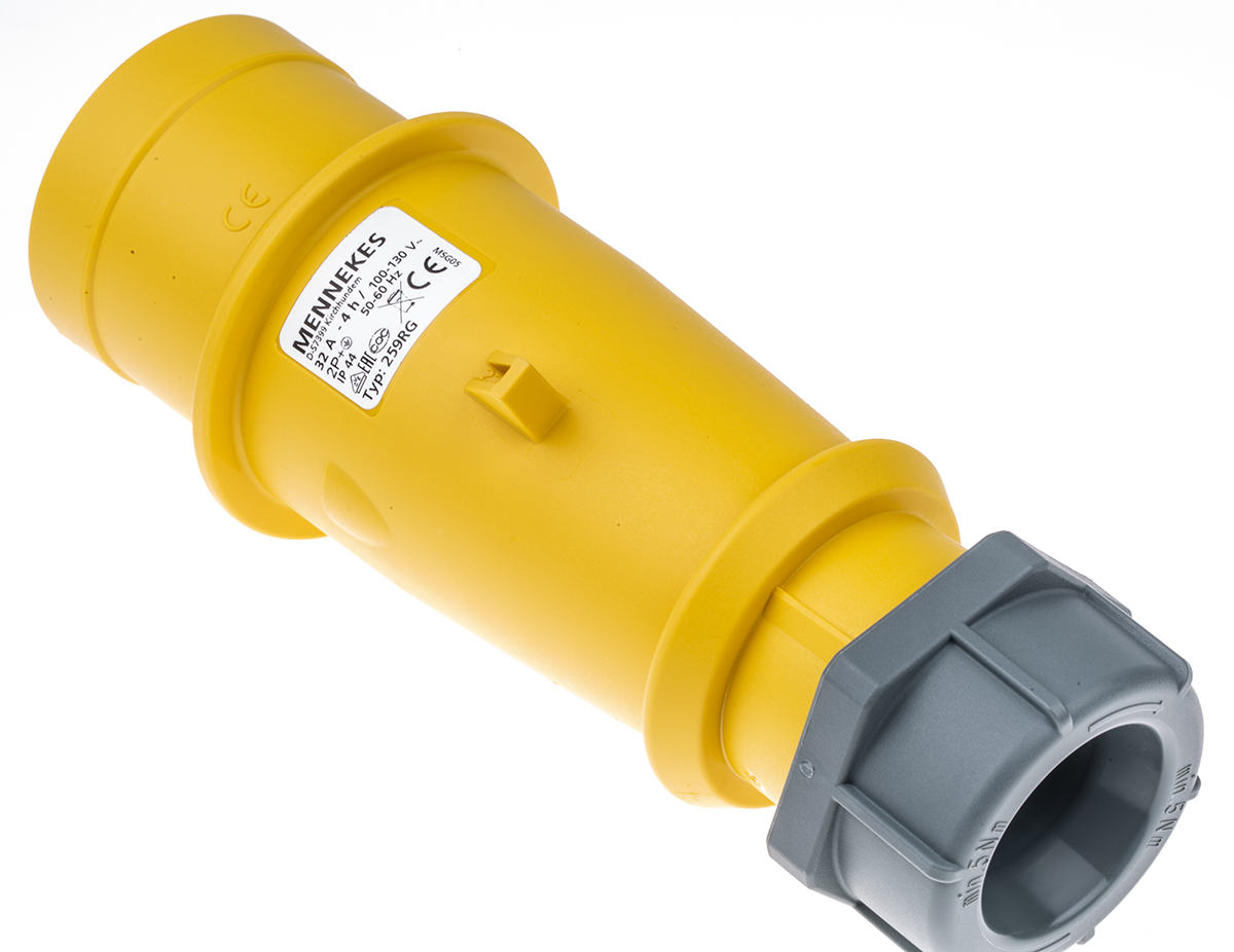 This is IP44 Yellow Cable Mount 3P Industrial Power Plug Rated At 32A 110 V manufactured by Mennekes. The manufacturer part number is 259. The product has a current rating of 32a. The product is available in cable mount configuration. It is IP rated with ip44. In addition, male is the available "Gender" of the product. It has a decent yellow colour. Moreover, the product has a nominal 110 v voltage rating. While the pole has 3p format. It allows screw terminal termination method. It comprises a plug. Whereas, the minimum operating temperature of the product is -25°c. The product am-top, is a highly preferred choice for users. The cross section area of the cable includes 2.5 → 6mm². It has a maximum operating temperature of +55°c. It has straight body orientation. It has low voltage no .