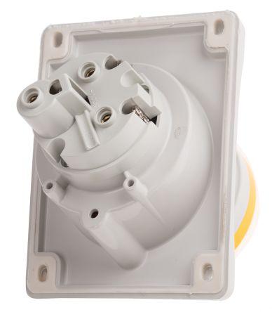 This is IP44 Yellow Flush Mount 2P+E Heavy Duty Power Connector Socket Rated At 32A 100 → 130 V manufactured by RS Pro. The manufacturer part number is 795-9855. The product has a current rating of 32.0a. The product is available in panel mount configuration. It is IP rated with ip44. In addition, female is the available "Gender" of the product. It has a decent yellow colour. Moreover, the product has a nominal 110.0 v voltage rating. While the pole has 2p+e format. It comprises a socket. It allows screw termination method. It has straight body orientation.