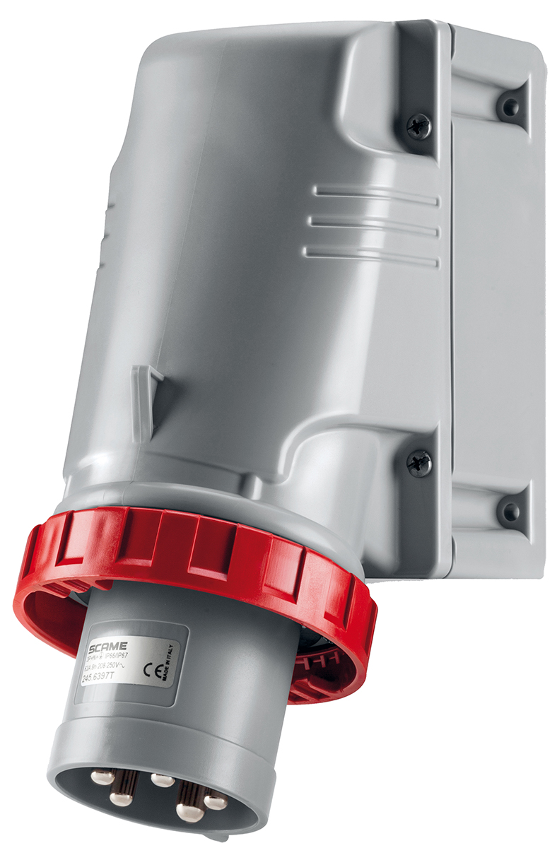This is IP67 Red Wall Mount 3P+N+E Industrial Power Plug Rated At 63.0A 415.0 V manufactured by Scame. The manufacturer part number is 245.6397T. The product has a current rating of 63a. The product is available in wall mount configuration. It is IP rated with ip67. In addition, male is the available "Gender" of the product. It has a decent red colour. Moreover, the product has a nominal 415 v voltage rating. While the pole has 3p + n + e format. It comprises a plug. It has straight body orientation.