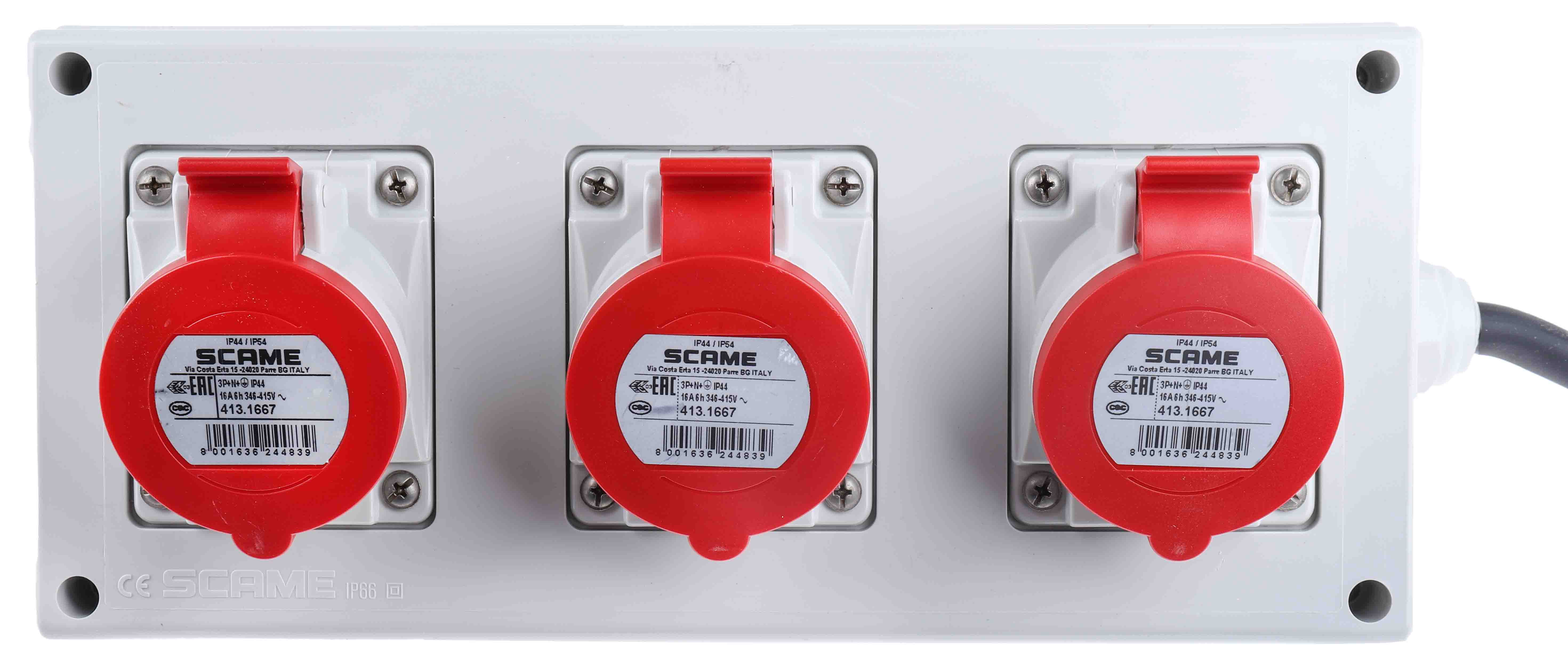 This is Red 3P+N+E Industrial Power Socket Rated At 16.0A 346 → 415 V manufactured by Scame. The manufacturer part number is 671.1637. The product has a current rating of 16a. The product is available in surface mount configuration. It is IP rated with ip44. It has a decent red colour. Moreover, the product has a nominal 346 → 415 v voltage rating. While the pole has 3p + n + e format. It comprises a socket.