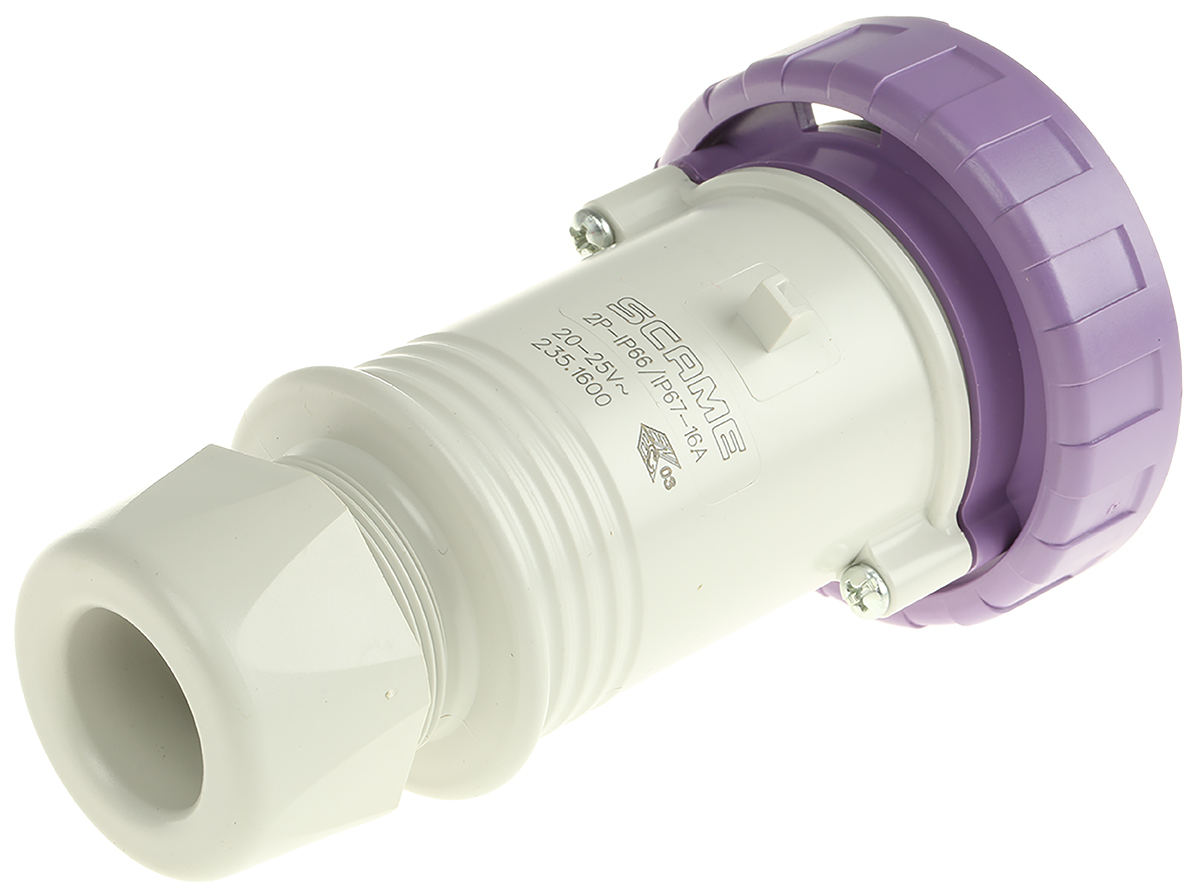 This is IP67 Purple Cable Mount 2P Industrial Power Plug Rated At 16.0A 20 → 25 V manufactured by Scame. The manufacturer part number is 235.1600. The product has a current rating of 16a. The product is available in cable mount configuration. It is IP rated with ip67. In addition, male is the available "Gender" of the product. It has a decent purple colour. Moreover, the product has a nominal 20 → 25 v voltage rating. While the pole has 2p format. It comprises a plug. Whereas, the minimum operating temperature of the product is -25°c. It has a maximum operating temperature of +40°c. It has straight body orientation. It has low voltage yes .