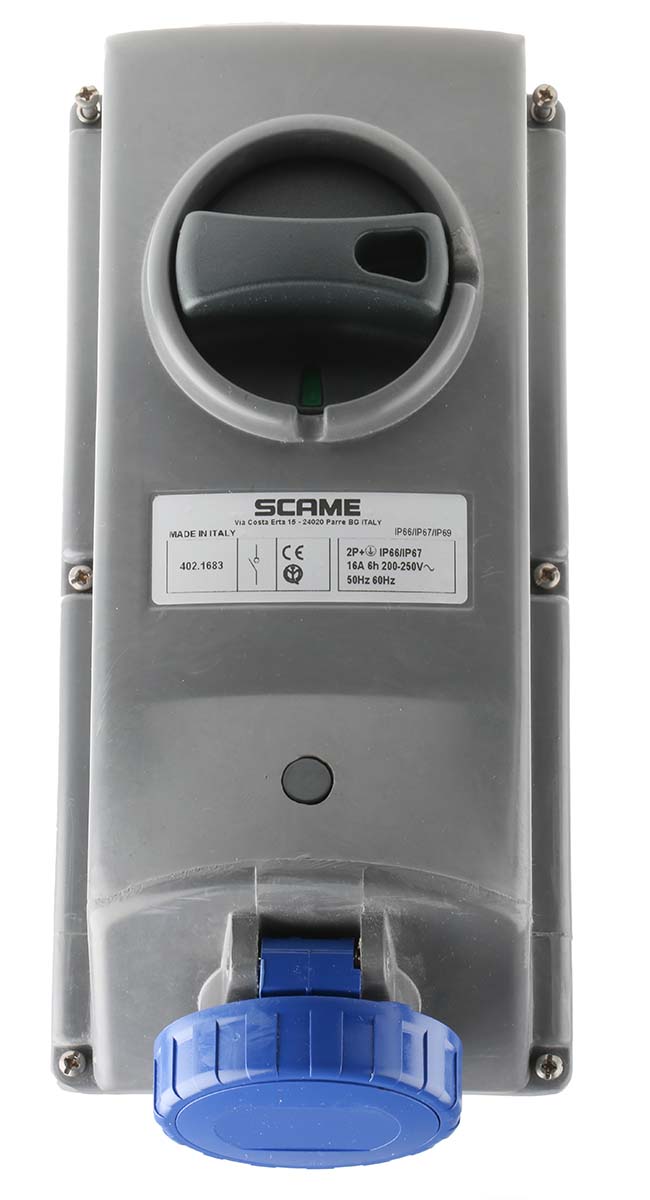 This is IP67 Blue Panel Mount 2P+E Right Angle Industrial Power Socket Rated At 16.0A 230.0 V manufactured by Scame. The manufacturer part number is 402.1683. The product has a current rating of 16a. The product is available in panel mount configuration. It is IP rated with ip67. In addition, female is the available "Gender" of the product. It has a decent blue colour. Moreover, the product has a nominal 230 v voltage rating. While the pole has 2p + e format. It comprises a socket. Whereas, the minimum operating temperature of the product is -25°c. It has a maximum operating temperature of +40°c. It has right angle body orientation.