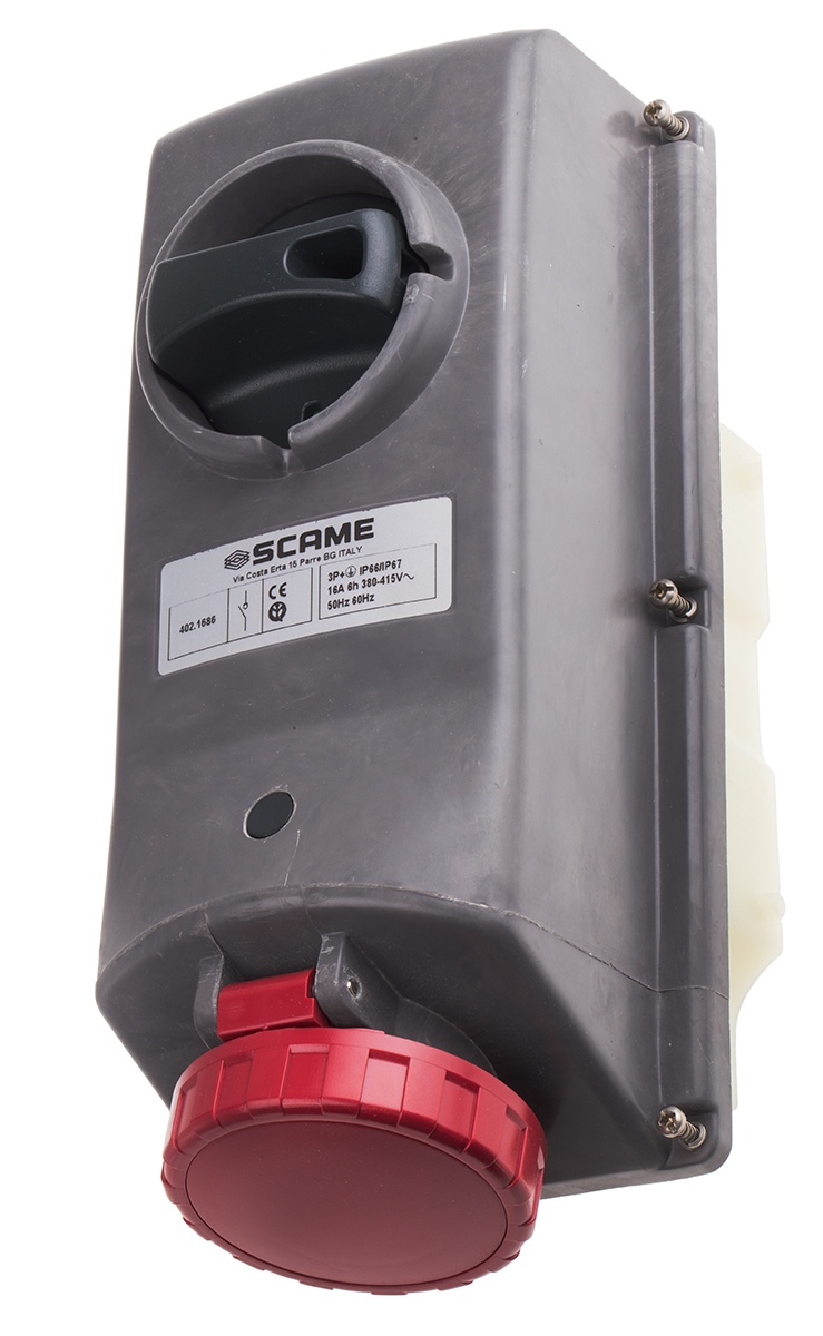 This is IP67 Red Panel Mount 3P+E Right Angle Industrial Power Socket Rated At 16.0A 415.0 V manufactured by Scame. The manufacturer part number is 402.1686. The product has a current rating of 16a. The product is available in panel mount configuration. It is IP rated with ip67. In addition, female is the available "Gender" of the product. It has a decent red colour. Moreover, the product has a nominal 415 v voltage rating. While the pole has 3p + e format. It comprises a socket. Whereas, the minimum operating temperature of the product is -25°c. It has a maximum operating temperature of +40°c. It has right angle body orientation.