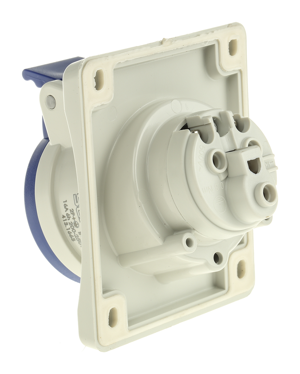 This is IP44 Yellow Panel Mount 2P+E Heavy Duty Power Connector Socket Rated At 16A 110 V manufactured by Scame. The manufacturer part number is 413.1663. The product has a current rating of 16a. The product is available in panel mount configuration. It is IP rated with ip44. In addition, female is the available "Gender" of the product. It has a decent blue colour. Moreover, the product has a nominal 230 v voltage rating. While the pole has 2p + e format. It comprises a socket. It allows screw termination method. It has straight body orientation.