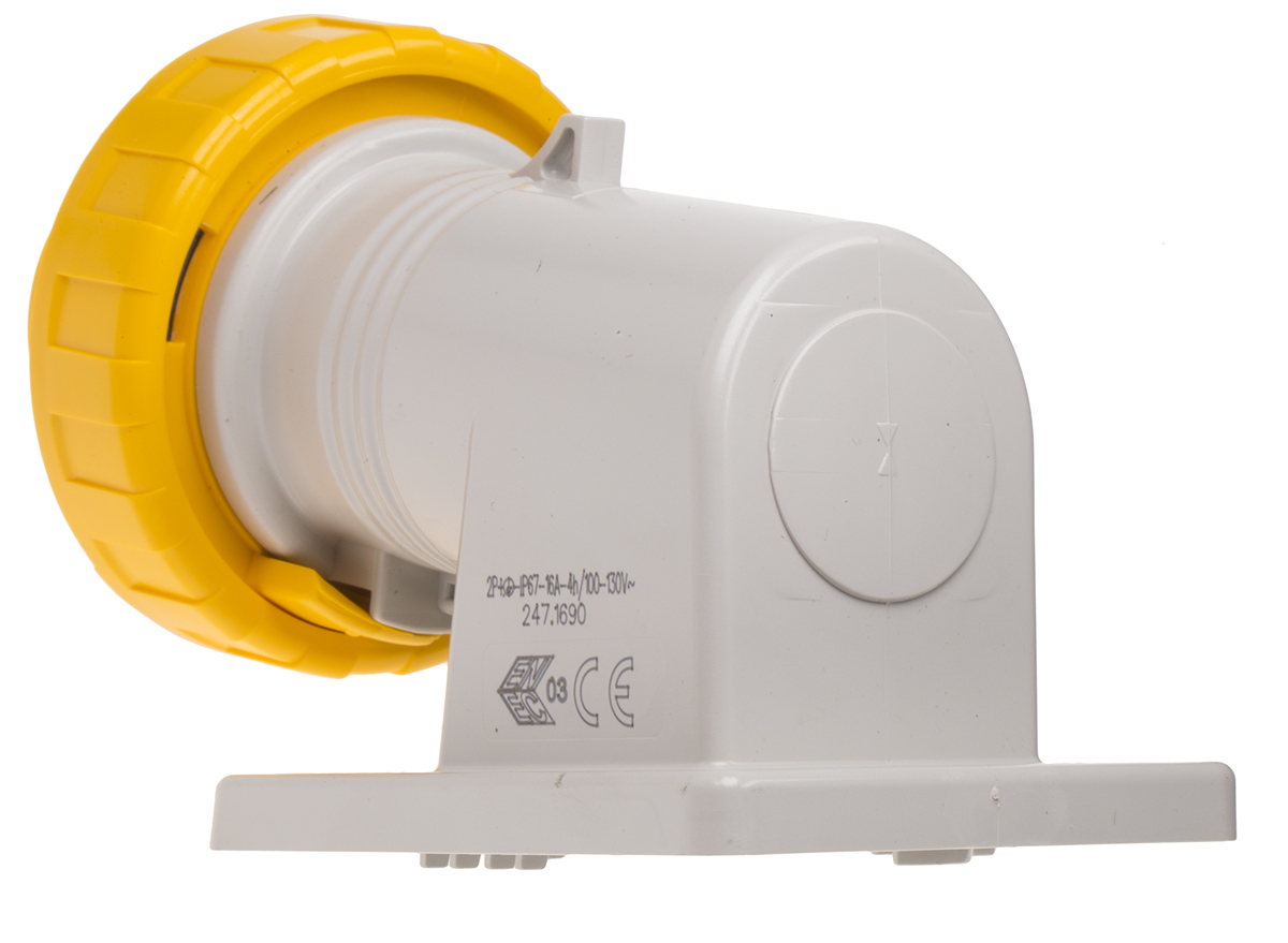 This is IP66 IP67 Yellow Wall Mount 2P+E Right Angle Industrial Power Plug Rated At 16A 110 V manufactured by Scame. The manufacturer part number is 247.1690. The product has a current rating of 16a. The product is available in wall mount configuration. It is IP rated with ip66, ip67. In addition, male is the available "Gender" of the product. It has a decent yellow colour. Moreover, the product has a nominal 110 v voltage rating. While the pole has 2p + e format. It comprises a plug. It has right angle body orientation.