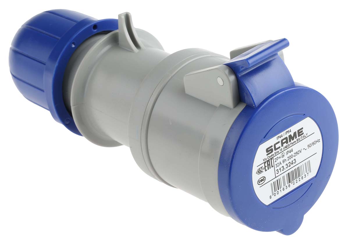 This is IP44 Blue Cable Mount 2P+E Industrial Power Socket Rated At 32A 230 V manufactured by Scame. The manufacturer part number is 313.3243. The product has a current rating of 32a. The product is available in cable mount configuration. It is IP rated with ip44. In addition, female is the available "Gender" of the product. It has a decent blue colour. Moreover, the product has a nominal 230 v voltage rating. While the pole has 2p + e format. It comprises a socket. It allows screw termination method. The cross section area of the cable includes 6.0mm². It has straight body orientation.