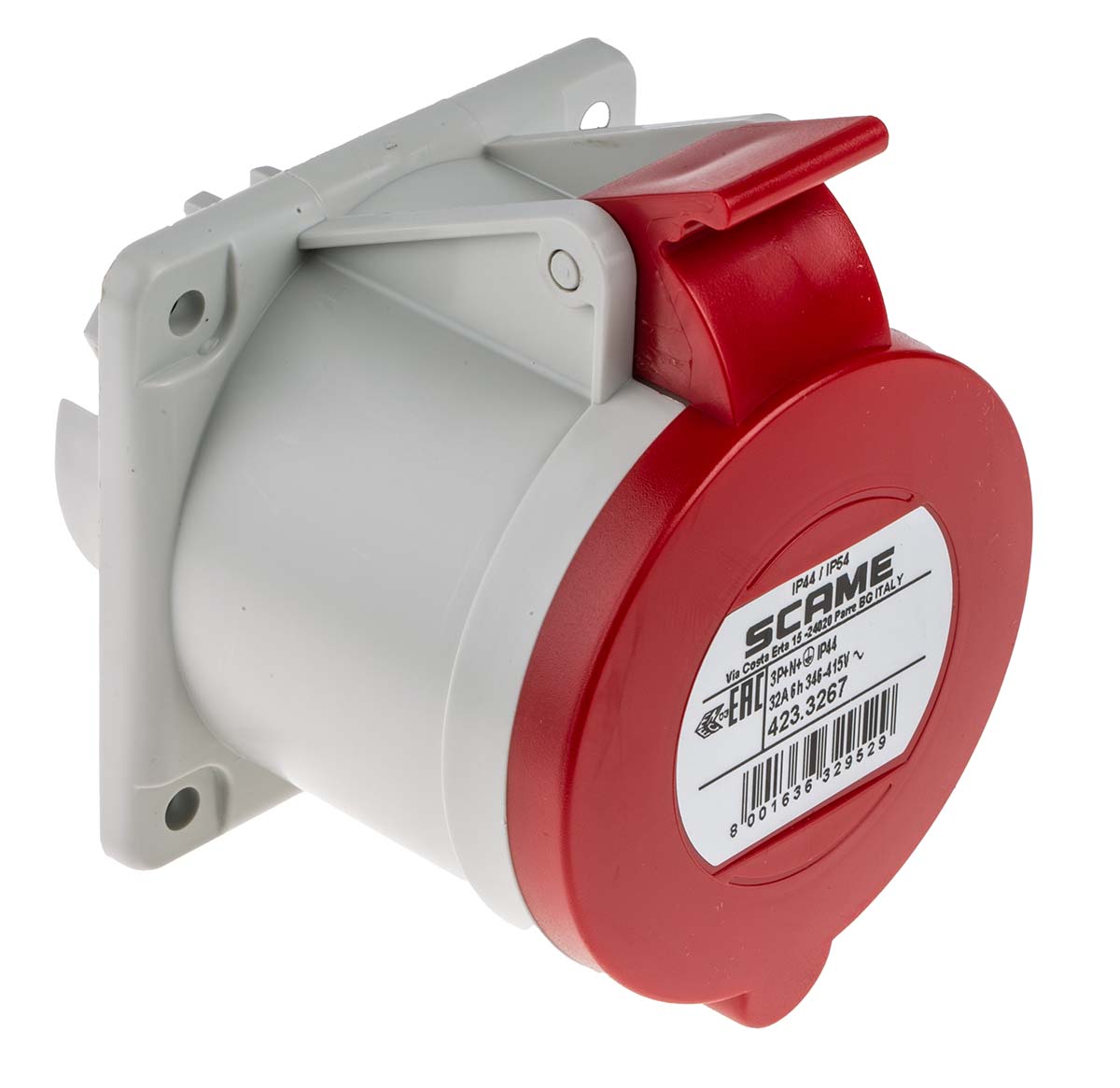 This is IP44 Red Panel Mount 3P + N + E Industrial Power Socket Rated At 32A 415 V manufactured by Scame. The manufacturer part number is 422.327. The product has a current rating of 32a. The product is available in panel mount configuration. It is IP rated with ip44. In addition, female is the available "Gender" of the product. It has a decent red colour. Moreover, the product has a nominal 415 v voltage rating. While the pole has 3p + n + e format. It comprises a socket. It allows screw termination method. It has straight body orientation.