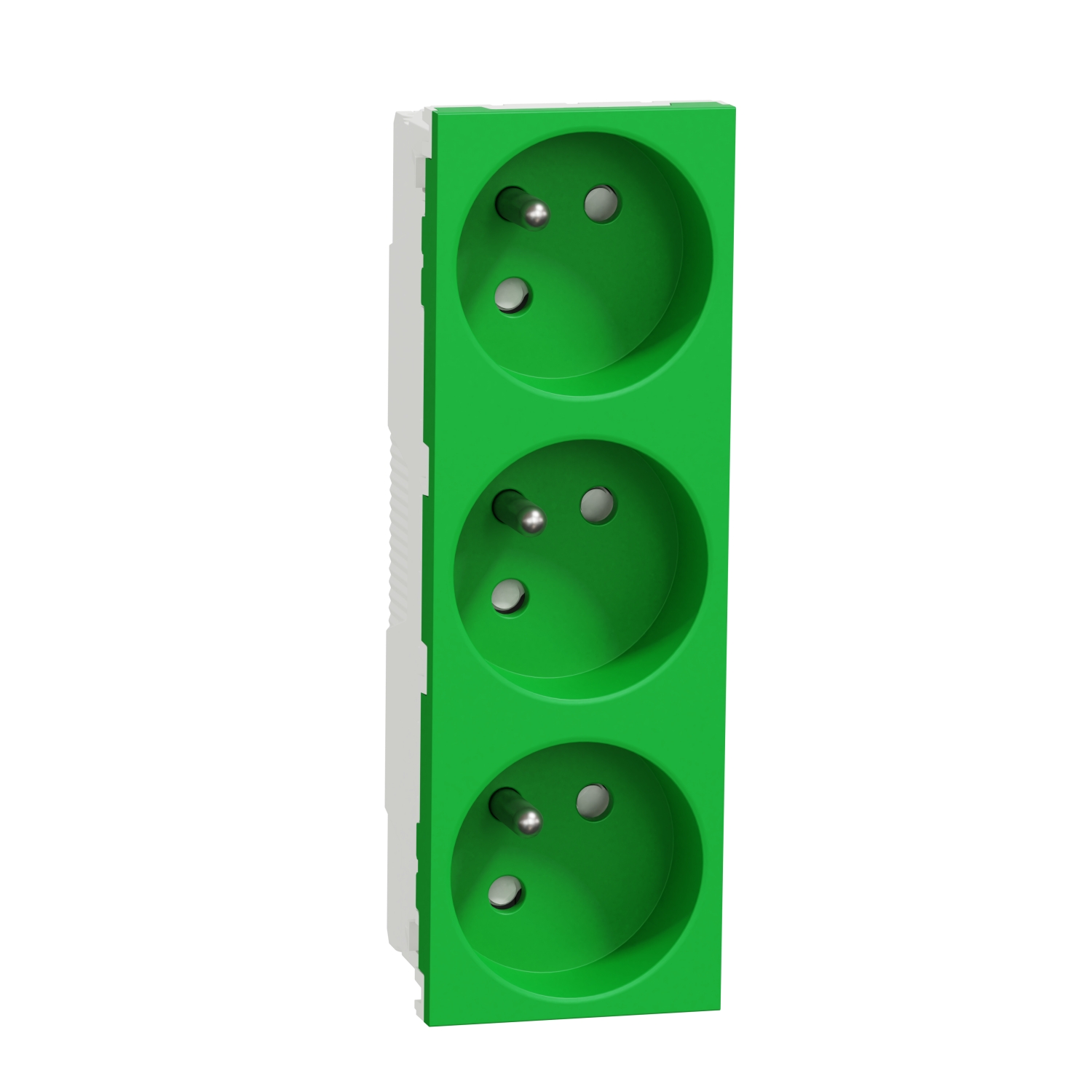This is New Unica IP3X Green Flush Mount 2P+E Socket Socket Rated At 16A 250 V manufactured by Schneider Electric. The manufacturer part number is NU307906. The product has a current rating of 16a. The product is available in flush mount configuration. It is IP rated with ip3x. The product new unica, is a highly preferred choice for users. It has a decent green colour. Moreover, the product has a nominal 250 v voltage rating. While the pole has 2p+e format. It comprises a socket. It includes 3 dedicated sockets . It has straight body orientation.