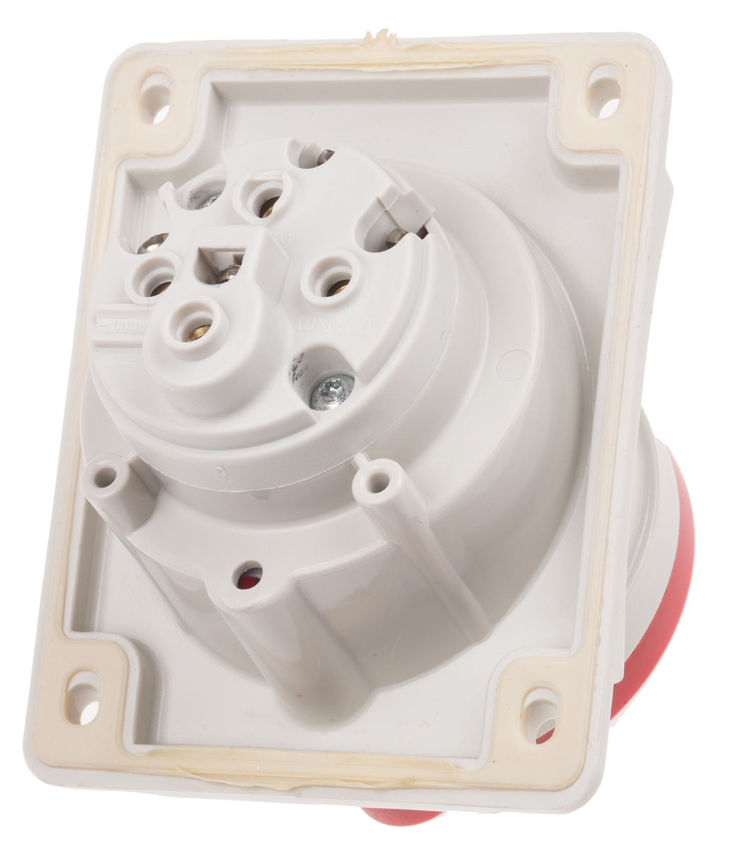 This is IP44 Red Panel Mount 3P + E Heavy Duty Power Connector Socket Rated At 16A 415 V manufactured by Scame. The manufacturer part number is 413.1666. The product has a current rating of 16a. The product is available in panel mount configuration. It is IP rated with ip44. In addition, female is the available "Gender" of the product. It has a decent red colour. Moreover, the product has a nominal 415 v voltage rating. While the pole has 3p + e format. It comprises a socket. It allows screw termination method. It has straight body orientation.
