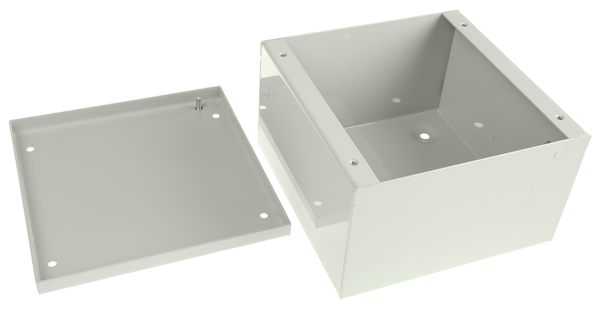 This is Steel Project Box Grey 150 x 150 x 90mm manufactured by RS Pro. The manufacturer part number is 232-052. The product complies with all safety standards, such as rohs. It has a carrying handle included no . It has a decent grey colour. It is ventilated no . Its external length includes 150 mm. The product's body is nicely designed from cold rolled steel materials. Features 150 x 150 x 90mm external caliber. While its external height is 90 mm. The product is 150 mm wide.