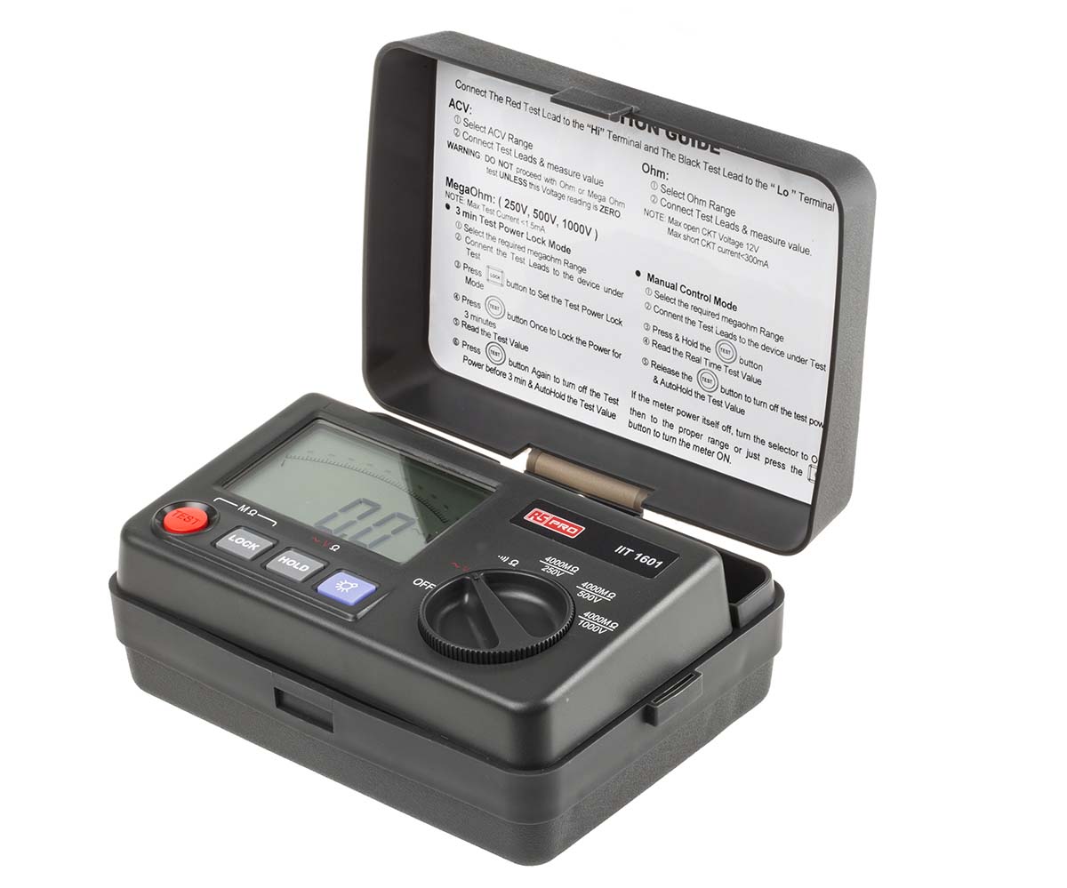 This is IIT1601 Insulation Tester 4000MΩ manufactured by RS Pro. The manufacturer part number is 123-2237. Additionally, it includes a/an insulation tester type tester . It features a remarkable lcd display. Moreover, the product gets power from battery. The typical product's weight is 900g. Moreover, its safety category level is footrest . It has a model number iit1601. In addition, the height is 77mm. Furthermore, the product is 140 mm wide. Its accurate length is 190mm. Whereas, the minimum operating temperature of the product is 0°c. It has a maximum 1000v test voltage . This aa battery is comparatively much efficient than common batteries. It has a minimum 250v test voltage . insulation tester is a versatile product designed to provide user-defined applications. It has a maximum operating temperature of 40°c. In addition, it has 1ma test current.