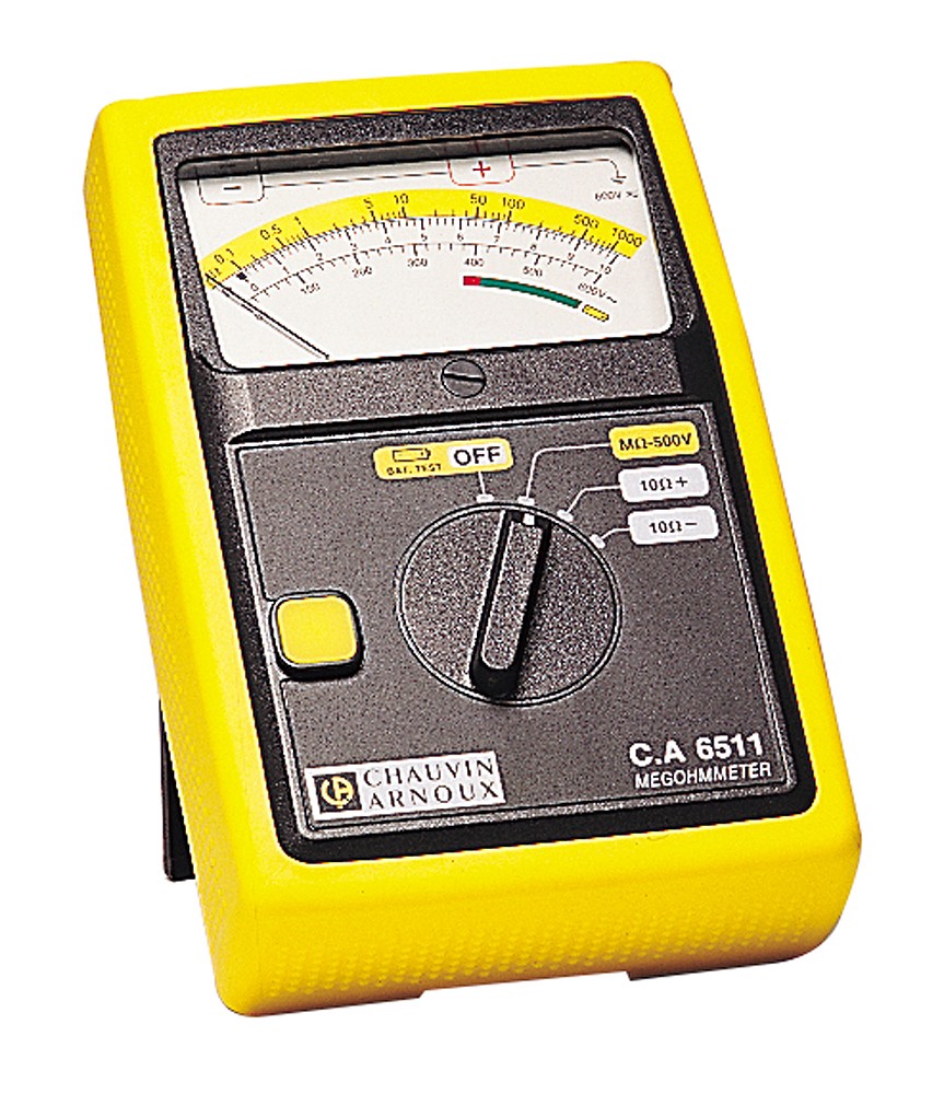 This is CA6511 Insulation Tester 500V 1000mΩ CAT II 600 V CAT III 300 V manufactured by Chauvin Arnoux. The manufacturer part number is P01140201. Additionally, it includes a/an insulation tester type tester . It features a remarkable analogue display. It has a minimum 500v test voltage . While it has ca6511 of model number. It has a maximum 1000mω insulation resistance measurement . It provides robust safety and is complied with cat ii 600 v, cat iii 300 v safety category. It has a maximum 500v test voltage .
