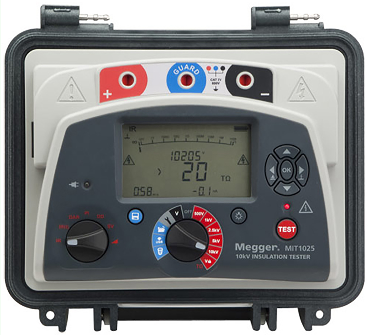 This is Insulation Tester 10000V 20TΩ CAT IV manufactured by Megger. The manufacturer part number is MIT1025. The given dimensions of the product include 315 x 285 x 181mm. Moreover, the product gets power from battery, mains. Furthermore, the product is 285mm wide. Its battery life is about 4.5 h . It has a maximum 10000v test voltage . In addition, it has 6ma test current. It has a minimum 500v test voltage . While it has mit1025 of model number. It has a maximum 20tω insulation resistance measurement . This li-ion battery is comparatively much efficient than common batteries. It has a maximum operating temperature of +50°c. Additionally, it includes a/an insulation tester type tester . Moreover, its safety category level is cat iv . Its accurate length is 315mm. It features a remarkable lcd display. The typical product's weight is 4.5kg. Its safety category voltage is 600v . The plug is a highly reliable type c - european plug, type g - british 3-pin with long service life. In addition, the height is 181mm. It provides robust safety and is complied with cat iv 600v safety category. Whereas, the minimum operating temperature of the product is -20°c.