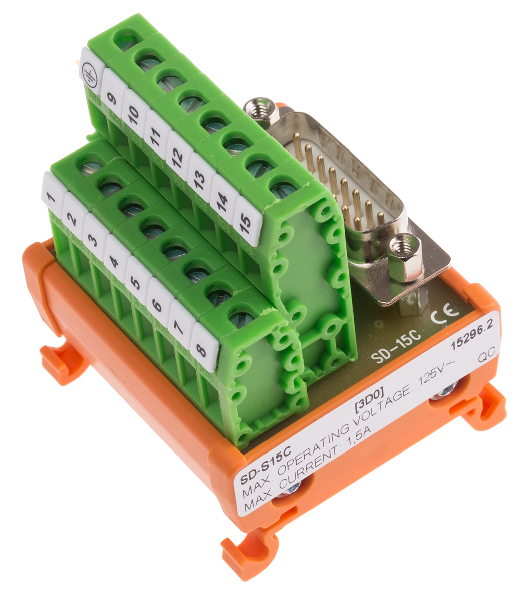 This is D-sub Interface Module DIN Rail Mount Male 15 Pole 125 V ac/dc 1.5A 51mm manufactured by RS Pro. The manufacturer part number is 665-9709. The product contains 15 contacts. The product has a current rating of 1.5a. The given dimensions of the product include 51 x 61 x 47mm. The product is available in din rail mount configuration. Moreover, the product has a nominal 125 v ac/dc voltage rating. In addition, male is the available "Gender" of the product. Its accurate length is 51mm. It has about [Standard Operating Voltage] test proof voltage . d-sub Connector type offer robust functionality. Furthermore, the product is 61mm wide. The product comes in 47mm depth. Whereas, the minimum operating temperature of the product is -20°c. The cross section area of the cable includes 0.2 → 2.5mm². Concerning wire's size, it is 22 → 14 awg. It has a maximum operating temperature of +50°c.