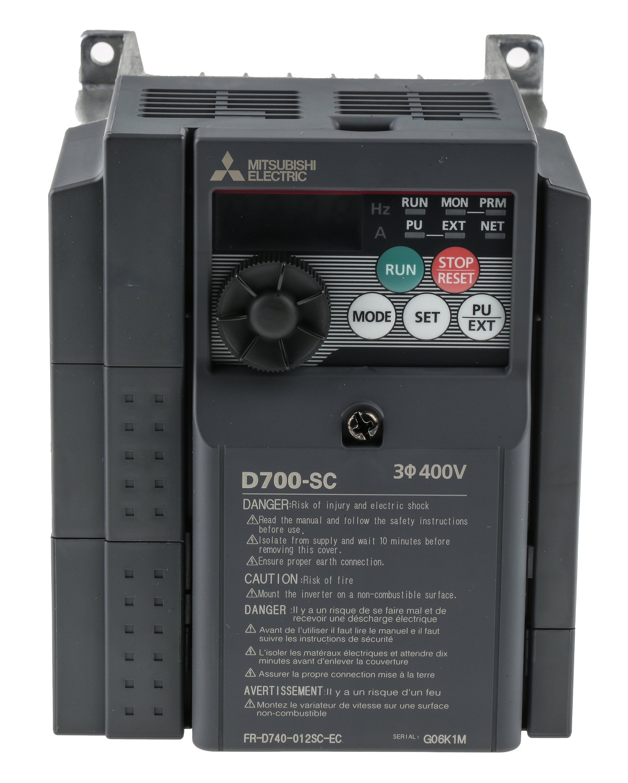 This is FR-D740 Inverter Drive 0.4 kW No 3-Phase In 380 → 480 V ac 1.2 A 0.2 → 400Hz Out ModBus manufactured by Mitsubishi. The manufacturer part number is FR-D740-012SC-EC. The product has a current rating of 1.2 a. It is IP rated with ip20. The product fr-d740, is a highly preferred choice for users. It has an overall width of 108mm. It includes a filter no . It includes a control panel yes . The product is highly suitable for ac motors. Features 400 v ac supply voltage. It has an overall length of 128mm. Concerning phase options, it features 3 configuration. Similarly, the product has 129.5mm of overall depth. Feature 0.4 kw of power rating. It has a/an modbus type bus communication . This product has an output frequency range of 0.2 → 400hz.