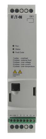 This is DE11 Variable Speed Starter 0.37 kW 1 (Input) 3 (Output)-Phase In 230 V ac 2.3 A 60Hz Out IP20 manufactured by Eaton. The manufacturer part number is DE11-122D3NN-N20N. The product has a current rating of 2.3 a. The product complies with all safety standards, such as ce, csa, culus, eac, ul. The product is available in din rail configuration. It is IP rated with ip20. The product de11, is a highly preferred choice for users. The product features a variable speed drive. The product also provides special features, such as enclosure protoction type is nema 0, no special drives engineering skills or knowledge required, out-of-the-box commissioning without parameterisation, short-circuit resistence. Its typical ambient temperature is approximately +60°c . It includes a control panel yes . The product is highly suitable for 230 v three-phase motors, 400 v three-phase motors. Features 230 v ac supply voltage. It has an overall length of 230mm. Concerning phase options, it features 1 configuration. Similarly, the product has 168mm of overall depth. Feature 0.37 kw of power rating. It has a/an canopen type bus communication . It has an overall width of 45mm. This product has an output frequency range of 60hz.