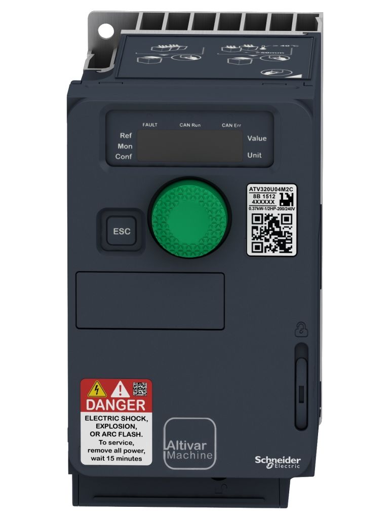Altivar ATV320 Series Professional range of AVT320 Variable speed drives from Schneider Electric. The Altivar machine AVT320 drive is a frequency inverter for 380 V to 500 V 3 phase asynchronous and synchronous motors rated from 0.18 KW to 15 KW and features more than 150 functions and is robust, compact and easy to install. The Logic function offers simple control system functions. With various communication cards available as options, the Altivar AVT320 drive integrates perfectly into the main control system architectures. All models are highly reliable and excellent quality. Features and Benefits Easy-fit communication cards in cassette format. STO: Safe Torque Off safety function SLS: Safely Limited Speed safety function SS1: Safe Stop 1 safety function SMS: Safe maximum Speed GDL: Guard Door Locking Different mounting options depending on the machine (vertical, horizontal, with the option to offset the control module when the drive is mounted on its side, side-by-side) Applications 150 further functions, including application-specific functions. (Conveying, cutting, hoisting, etc.)