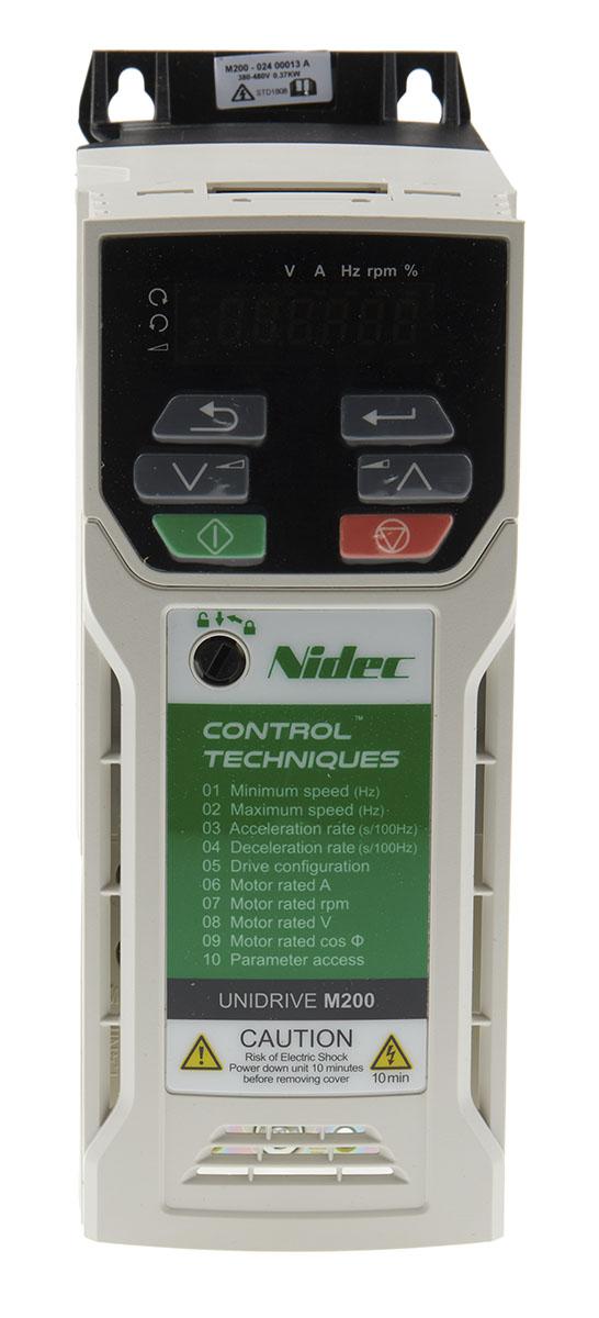 This is Inverter Drive 3 Phase 0.37kW 0.5A manufactured by Control Techniques. The manufacturer part number is M200-02400013. It performs basic function of motor control. The product has a current rating of 1.3 a. The product is available in panel mount configuration. It is IP rated with ip20. The product m200, is a highly preferred choice for users. The product features a vector control drive. It includes a filter yes . It includes a control panel yes . The product is highly suitable for induction motor control. Features 380 → 480 v ac supply voltage. It has an overall length of 205mm. Concerning phase options, it features 3 configuration. Similarly, the product has 150mm of overall depth. Feature 0.37 kw of power rating. It has a/an canopen, devicenet, ethercat, ethernet, modbus, profibus, profinet type bus communication . It has an overall width of 75mm. This product has an output frequency range of 0 → 550hz.