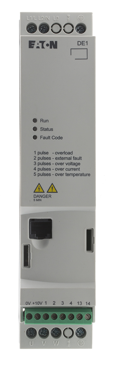 This is DE11 Variable Speed Starter 1-Phase In 60Hz Out 0.37 kW 230 V ac 2.3 A manufactured by Eaton. The manufacturer part number is 180657 DE11-122D3NN-N20N. Is it a better world product? yes. The product has a current rating of 2.3 a. The product complies with all safety standards, such as ce, csa, culus, eac, ul. The product is available in din rail configuration. It is IP rated with ip20. The product eaton moeller, is a highly preferred choice for users. The product features a variable speed drive. In has an STO no . The product also provides special features, such as enclosure protoction type is nema 0, no special drives engineering skills or knowledge required, out-of-the-box commissioning without parameterisation, short-circuit resistence. It includes a control panel yes . The product is highly suitable for ac motors. Features 230 v ac supply voltage. It has an overall length of 230mm. Concerning phase options, it features 1 configuration. Similarly, the product has 168mm of overall depth. Feature 0.37 kw of power rating. It has a/an canopen type bus communication . It has an overall width of 45mm. This product has an output frequency range of 60hz.