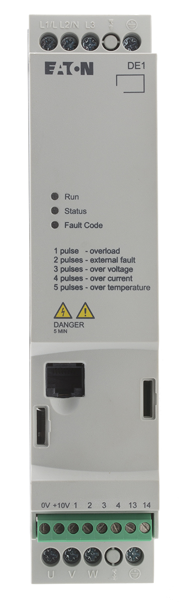 This is DE11 Variable Speed Starter 3-Phase In 60Hz Out 0.75 kW 480 V ac 2.1 A manufactured by Eaton. The manufacturer part number is 180671 DE11-342D1NN-N20N. Is it a better world product? yes. The product has a current rating of 2.1 a. The product complies with all safety standards, such as ce, csa, culus, eac, ul. The product is available in din rail configuration. It is IP rated with ip20. The product eaton moeller, is a highly preferred choice for users. The product features a variable speed drive. In has an STO no . The product also provides special features, such as enclosure protoction type is nema 0, no special drives engineering skills or knowledge required, out-of-the-box commissioning without parameterisation, short-circuit resistence. It includes a control panel yes . The product is highly suitable for ac motors. Features 480 v ac supply voltage. It has an overall length of 230mm. Concerning phase options, it features 3 configuration. Similarly, the product has 168mm of overall depth. Feature 0.75 kw of power rating. It has a/an canopen type bus communication . It has an overall width of 45mm. This product has an output frequency range of 60hz.