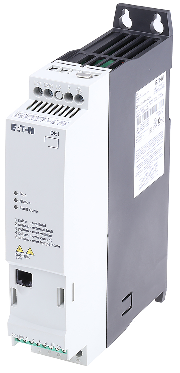 This is PowerXL DE1 Variable Speed Starter 1-Phase In 300Hz Out 1.5 kW 230 V ac 7 A manufactured by Eaton. The manufacturer part number is 174331 DE1-127D0FN-N20N. The product has a current rating of 7 a. It is IP rated with ip20. It has an overall width of 45mm. In has an STO no . It includes a filter yes . The product is highly suitable for ac motors. Features 230 v ac supply voltage. It has an overall length of 45mm. Concerning phase options, it features 1 configuration. Similarly, the product has 231mm of overall depth. Feature 1.5 kw of power rating. It has a/an modbus rtu type bus communication . This product has an output frequency range of 300hz.
