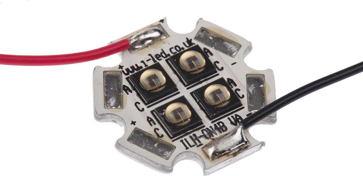 This is ILS OSLON Black PowerStar 850nm IR LED Module PCB Mounted manufactured by Intelligent LED Solutions. The manufacturer part number is ILH-IW04-85SL-SC211-WIR200.. The given dimensions of the product include 20 x 20 x 3.5mm. The product is available in surface mount configuration. The product oslon black powerstar, is a highly preferred choice for users. It has a 4120mw radiant flux . Its radiant intensity is approximately 4120 mw . The package is a sort of pcb. It consists of 4 LEDs. This integrated adorable lens is [Lense Shape] shaped lens with exquisite design. Whereas, its peak wavelength is 850nm .