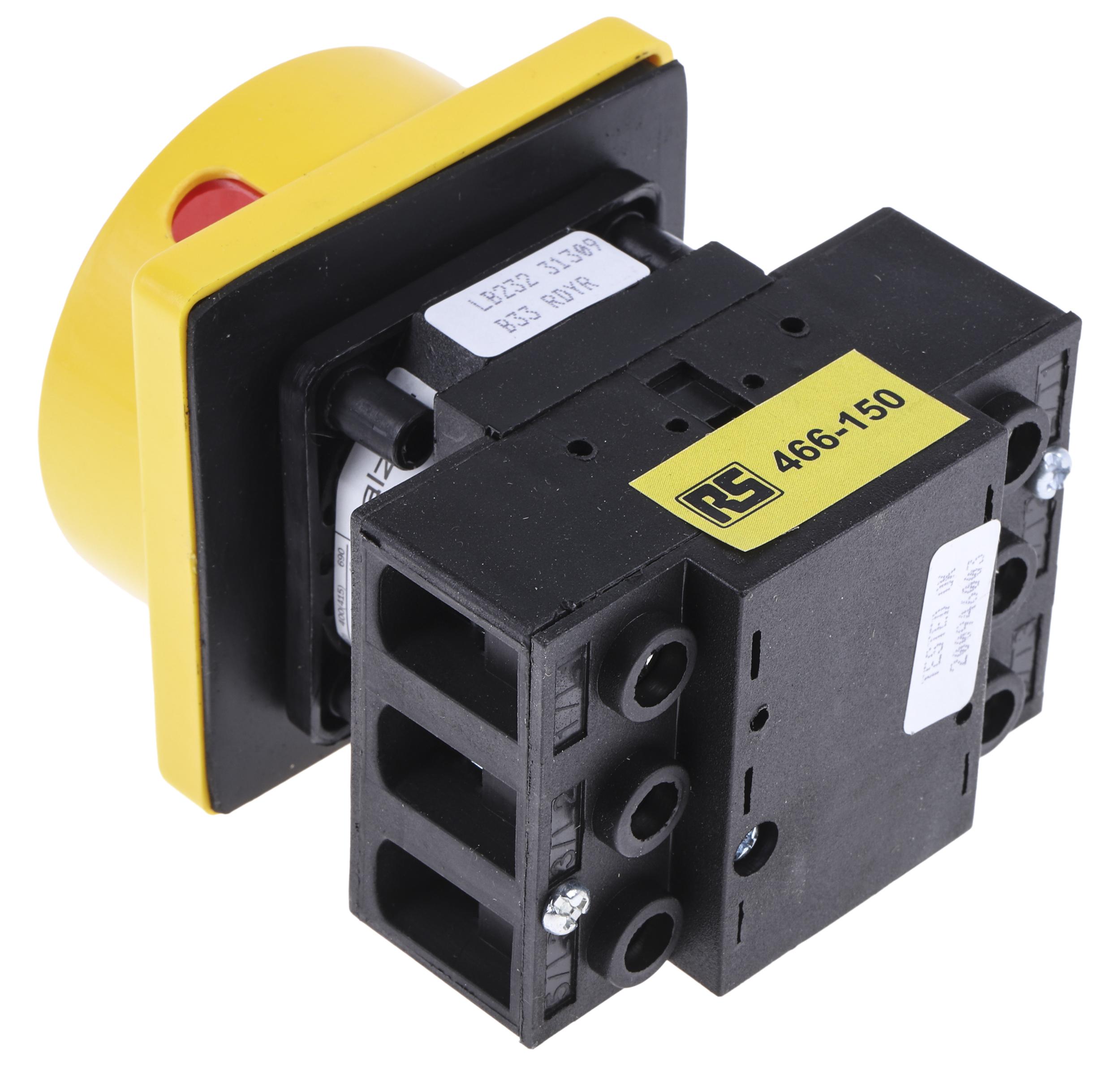 This is 3 Pole Panel Mount Non Fused Isolator Switch 32 A 11 kW IP65 manufactured by RS Pro. The manufacturer part number is 466-150. It also carries 32a maximum current. Moreover, it is designed with 6kv switch rating . The product is available in panel mount configuration. It is IP rated with ip65. It accepts padlocks yes . It has a maximum operating temperature of +40°c. Moreover, the product has a nominal 750v voltage rating. Its accurate length is 125mm. Furthermore, the product is 100mm wide. The product comes in 70mm depth. Whereas, the minimum operating temperature of the product is -25°c. Its electrical phase configuration includes 3. Feature 11kw of power rating. It has equipped with 3p poles. The terminal is a screw type. Its handle is of red colour .