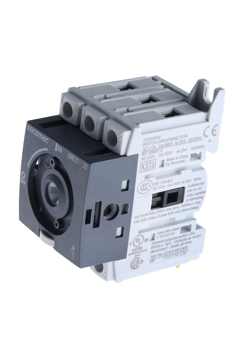 This is 3 Pole DIN Rail Non Fused Isolator Switch NO/3NC (Auxiliary) 25 A 11 kW @ 400 and 500 V ac 15 kW @ 690 V ac manufactured by Socomec. The manufacturer part number is 2200 3002. It also carries 25a maximum current. Moreover, it is designed with 25a switch rating . It is IP rated with ip20. It accepts padlocks yes . The product sirco m, is a highly preferred choice for users. Whereas, the minimum operating temperature of the product is -25°c. Moreover, the product has a nominal 690v ac voltage rating. Its accurate length is 68mm. Furthermore, the product is 45mm wide. The product comes in 64mm depth. It has auxiliary available contacts yes . Its electrical phase configuration includes 3. It features sirco range. The normal state configuration includes no/3nc (auxiliary). Feature 11kw of power rating. It has a maximum operating temperature of +70°c. It has equipped with 3p poles. The terminal is a screw type. Its handle is of blue, red colour .