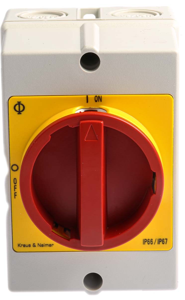 This is 3 Pole Non Fused Isolator Switch 25 A 7.5 kW IP66 IP67 manufactured by Kraus & Naimer. The manufacturer part number is KG20 T203/GBA283 KS1V. It also carries 25a maximum current. It is IP rated with ip66, ip67. It accepts padlocks yes . It has a maximum operating temperature of +55°c. Moreover, the product has a nominal 690v ac voltage rating. Its accurate length is 121mm. Furthermore, the product is 86mm wide. The product comes in 107mm depth. Its electrical phase configuration includes 3. Feature 7.5kw of power rating. It has equipped with 3p poles. The terminal is a wire lead type. Its handle is of red/yellow colour .