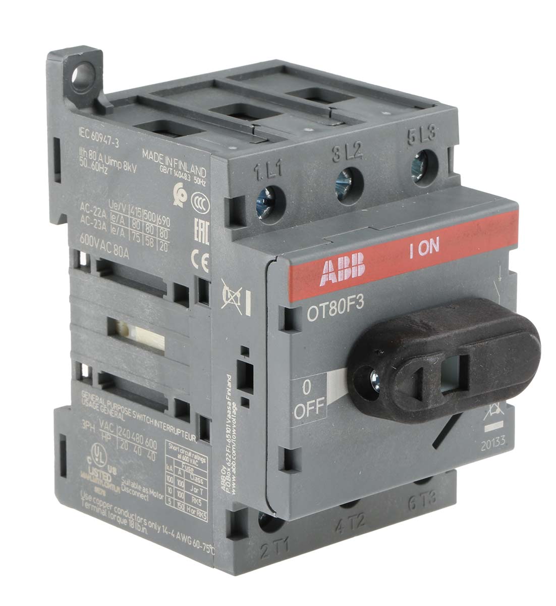 This is 3 Pole DIN Rail Non Fused Isolator Switch - 80 A Maximum Current 37 kW Power Rating IP20 manufactured by ABB. The manufacturer part number is OT80F3 1SCA105798R1001. It also carries 80a maximum current. Moreover, it is designed with 1ka switch rating . The product is available in din rail configuration. It is IP rated with ip20. It has a maximum operating temperature of +40°c. Moreover, the product has a nominal 750v ac voltage rating. Its accurate length is 92mm. It has a model number ot80f3. Furthermore, the product is 53mm wide. The product comes in 73mm depth. The normal state configuration includes 3p. Its electrical phase configuration includes 3. Feature 37kw of power rating. It has equipped with 3p poles. The terminal is a screw type.