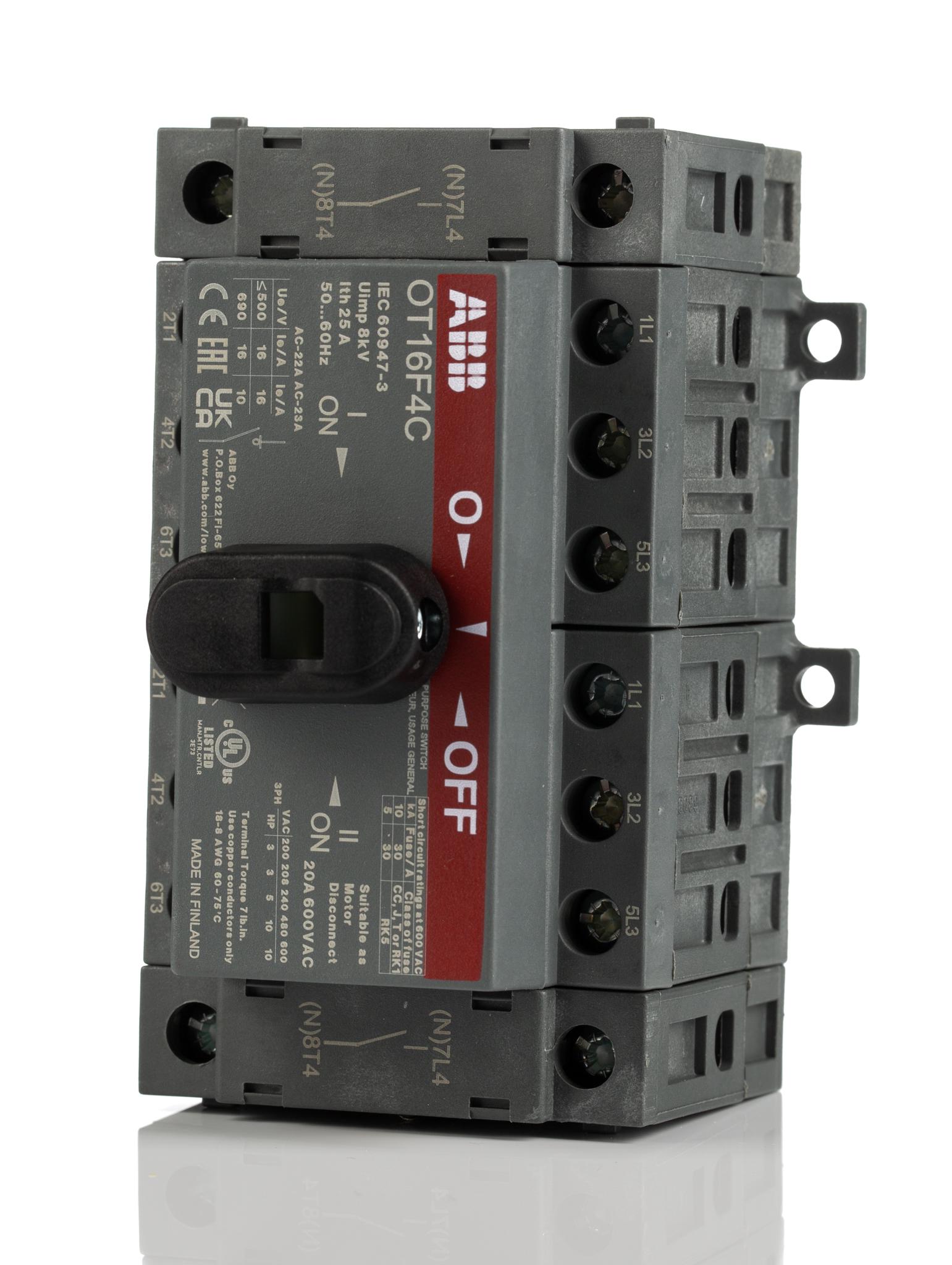 This is 4 Pole DIN Rail Non Fused Isolator Switch - 16 A Maximum Current manufactured by ABB. The manufacturer part number is OT16F4C 1SCA104831R1001. It also carries 16a maximum current. The product is available in din rail configuration. It is IP rated with ip20. The product ot, is a highly preferred choice for users. Moreover, the product has a nominal 750v ac voltage rating. Its accurate length is 68mm. It has a model number 1sca104831r1001. Furthermore, the product is 96mm wide. The product comes in 68mm depth. The normal state configuration includes 4no. Its electrical phase configuration includes 3. It has auxiliary available contacts yes . It has a maximum operating temperature of +40°c. It has equipped with 4p poles. In addition, it has a double throw configuration .