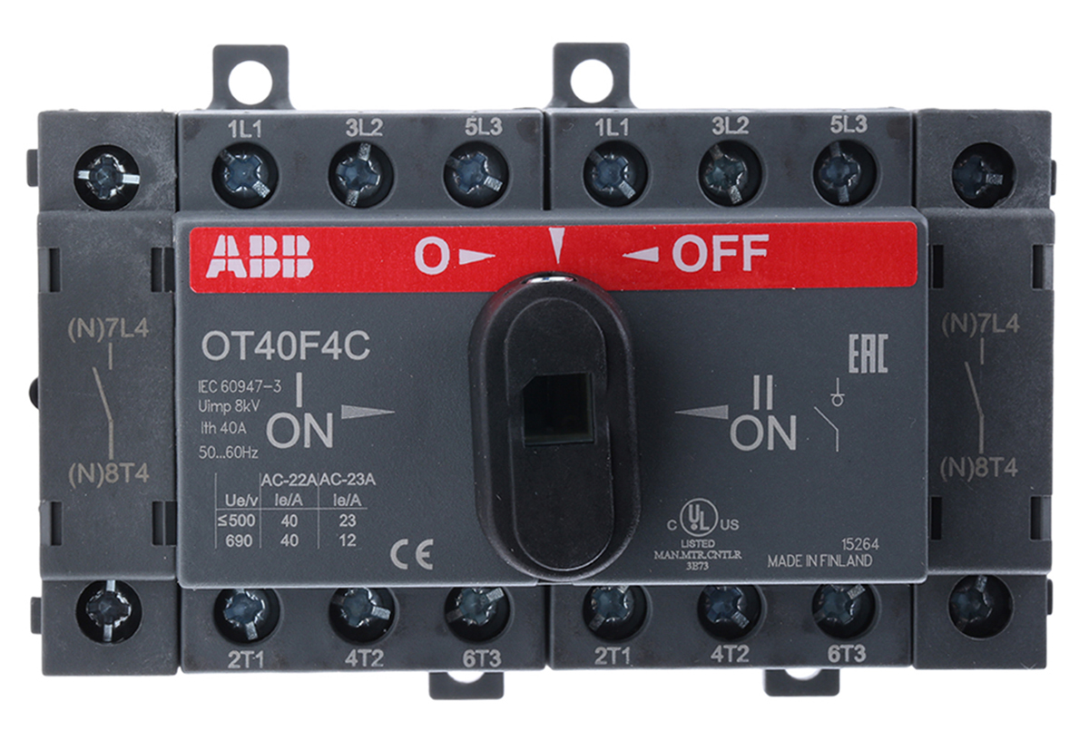 This is 4 Pole DIN Rail Non Fused Isolator Switch - 40 A Maximum Current manufactured by ABB. The manufacturer part number is OT40F4C 1SCA104934R1001. It also carries 40a maximum current. The product is available in din rail configuration. It is IP rated with ip20. It has a maximum operating temperature of +40°c. Moreover, the product has a nominal 750v voltage rating. Its accurate length is 68mm. It has a model number ot40f4c. Furthermore, the product is 96mm wide. The product comes in 68mm depth. The normal state configuration includes 4no. Its electrical phase configuration includes 3. It has auxiliary available contacts yes . It has equipped with 4p poles. In addition, it has a double throw configuration .