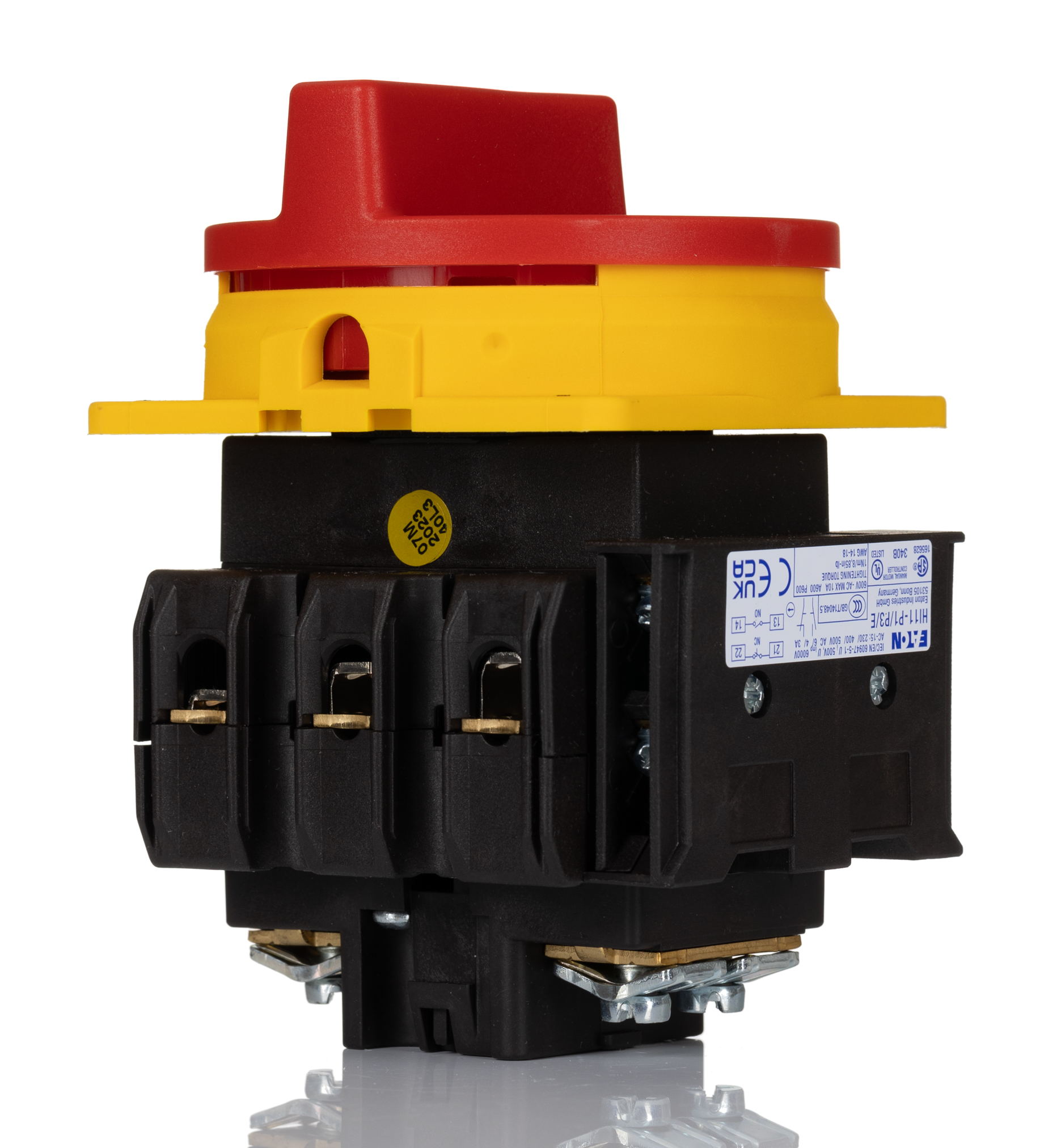 This is 3 Pole Panel Mount Non-Fused Switch Disconnector - 63A Maximum Current 37kW Power Rating IP65 manufactured by Eaton. The manufacturer part number is 019891 P3-63/EA/SVB/HI11. It also carries 63a maximum current. Moreover, it is designed with 640a switch rating . The product is available in panel mount configuration. It is IP rated with ip65. It accepts padlocks yes . The product is enclosed . Whereas, the minimum operating temperature of the product is -25°c. Moreover, the product has a nominal 690v voltage rating. Its accurate length is 87mm. In addition, it has a single throw configuration . Furthermore, the product is 96mm wide. The product comes in 114mm depth. It has auxiliary available contacts yes . Its electrical phase configuration includes 1, 3. The normal state configuration includes 3no. Feature 37kw of power rating. It has a maximum operating temperature of +50°c. It has equipped with 3p poles. The terminal is a screw type. Its handle is of red colour .
