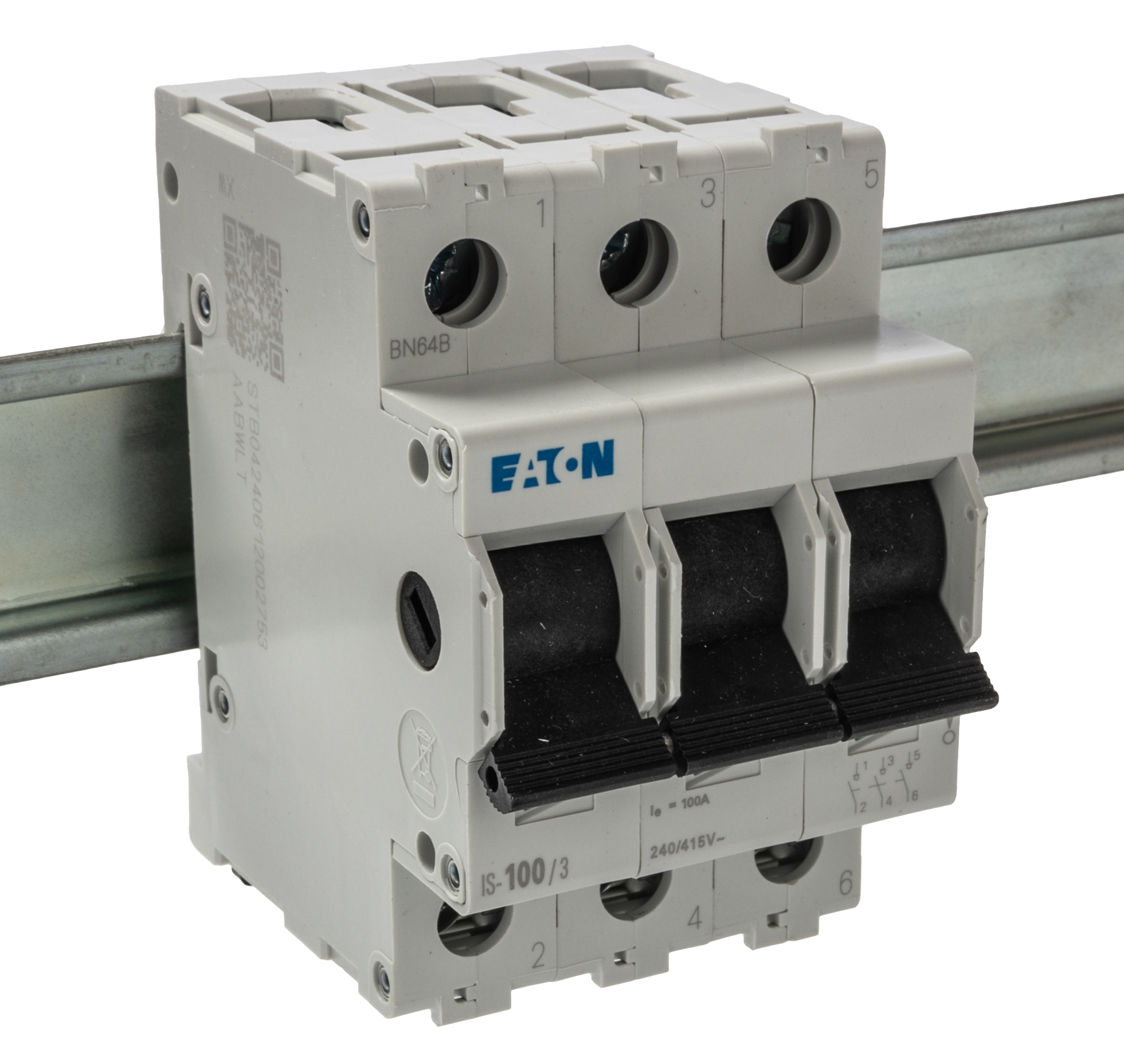 This is 3 Pole Switch Disconnector - 100A Maximum Current IP40 manufactured by Eaton. The manufacturer part number is 276284 IS-100/3. It also carries 100a maximum current. Moreover, it is designed with 2ka switch rating . The product is available in surface mount configuration. It is IP rated with ip40. Whereas, the minimum operating temperature of the product is -5°c. It has a maximum operating temperature of +40°c. Moreover, the product has a nominal 415v voltage rating. Its accurate length is 52.5mm. It has a model number is-100/3. In addition, it has a single throw configuration . Furthermore, the product is 65.5mm wide. The product comes in 80mm depth. Its electrical phase configuration includes 3. The normal state configuration includes 3no. It has equipped with 3p poles. The terminal is a screw type. Its handle is of black colour .