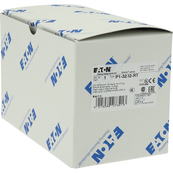This is 3 Pole Surface Mount Isolator Switch - 32A Maximum Current 15kW Power Rating IP65 manufactured by Eaton. The manufacturer part number is 207321 P1-32/I2-RT. Feature 15kw of power rating. It has equipped with 3 poles. It also carries 32a maximum current. The product is available in surface mount configuration. It is IP rated with ip65.