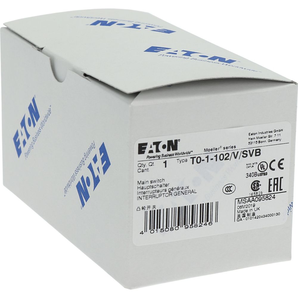 This is Non Fused Isolator Switch - 20A Maximum Current IP65 manufactured by Eaton. The manufacturer part number is 095824 T0-1-102/V/SVB. The product is not-enclosed . It also carries 20a maximum current. The product is available in rear panel configuration. It is IP rated with ip65. The product moeller, is a highly preferred choice for users. Moreover, the product has a nominal 690v voltage rating. Its accurate length is 118mm. Furthermore, the product is 65mm wide. The product comes in 118mm depth. It has auxiliary available contacts no . Whereas, the minimum operating temperature of the product is -25°c. Its electrical phase configuration includes single, three. Feature 5.5kw of power rating. It has a maximum operating temperature of +50°c. It has equipped with 2 poles. The terminal is a screw type. Its handle is of red colour .