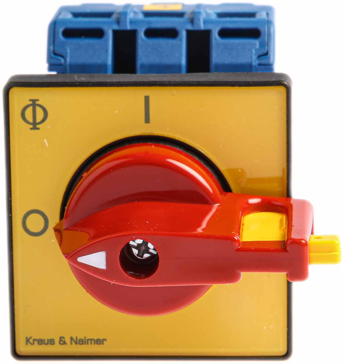 This is 3P Pole Panel Mount Isolator Switch - 32A Maximum Current 11kW Power Rating IP65 manufactured by Kraus & Naimer. The manufacturer part number is KG32A.T203/GBA011.FT2. It also carries 32a maximum current. The product is available in panel mount configuration. Moreover, the product has a nominal 690v ac voltage rating. It accepts padlocks yes . It has a maximum operating temperature of +55°c. It is IP rated with ip65. Its electrical phase configuration includes 3. Feature 11kw of power rating. It has equipped with 3p poles. The terminal is a wire lead type. Its handle is of red/yellow colour .