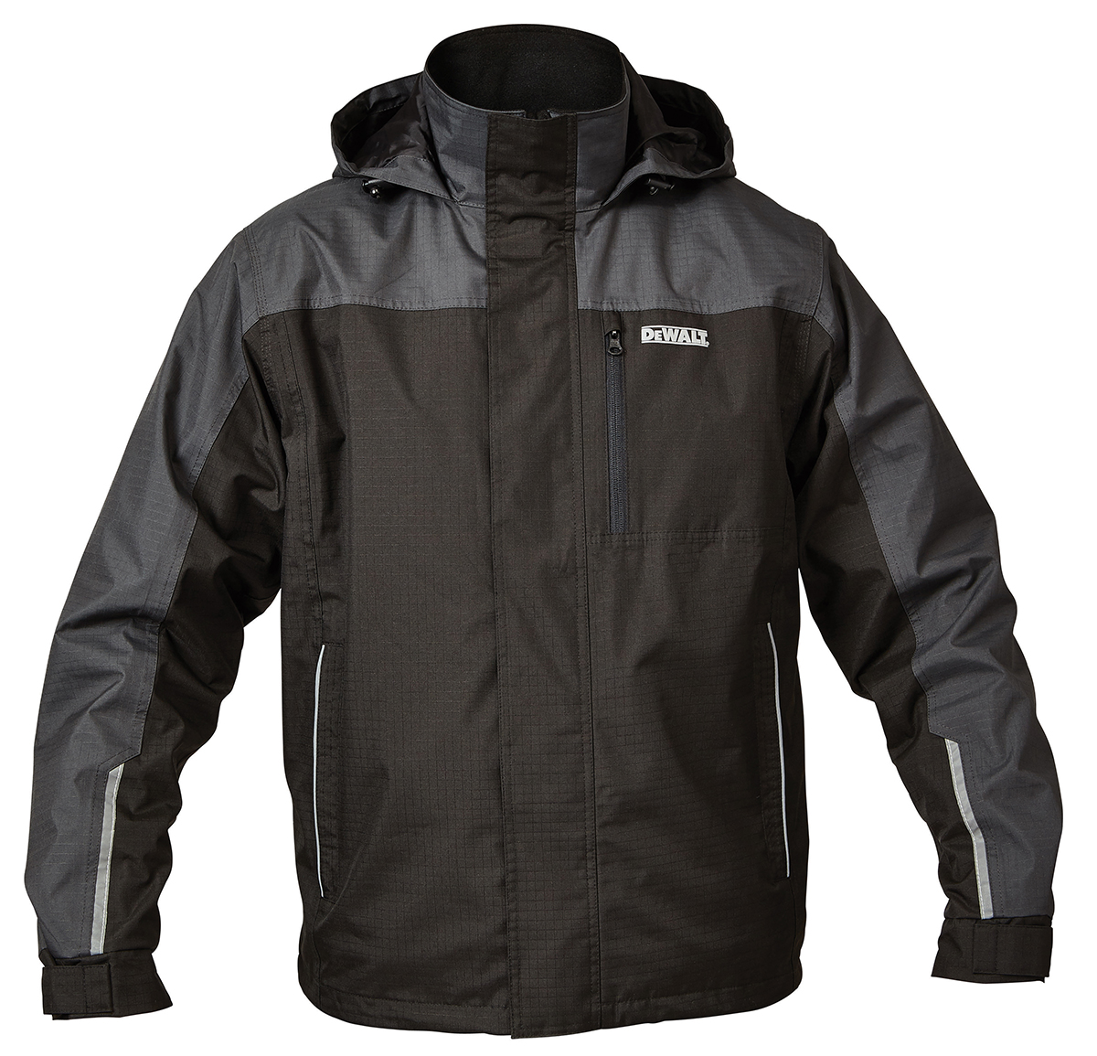 DeWalt Storm Waterproof Hooded Jacket DeWalt Storm waterproof jacket includes a concealed hood with a toggle adjustment and a zip front fastening plus a protective storm flap. The jacket is lightweight complete with a lowered back, vented back panel and hook and loop cuffs. All the pockets are zipped with 1 breast pocket and 2 lower front hand pockets. This stylish and modern design is finished with reflective piping to the lower arms and pockets. FEATURES and BENEFITS: Storm Waterproof jacket Made from Rip-Stop Polyester Polyester mesh lining Concealed hood with toggle adjustment Full length front zip Storm flap Lowered back Back vented panel Adjustable hook and loop cuffs Zipped pockets, I breast, 2 lower front hand pockets Reflective piping to lower arms and pockets Lightweight Modern Style Various sizes available Dewalt Workwear: Gillets, Sweatshirts & Trousers