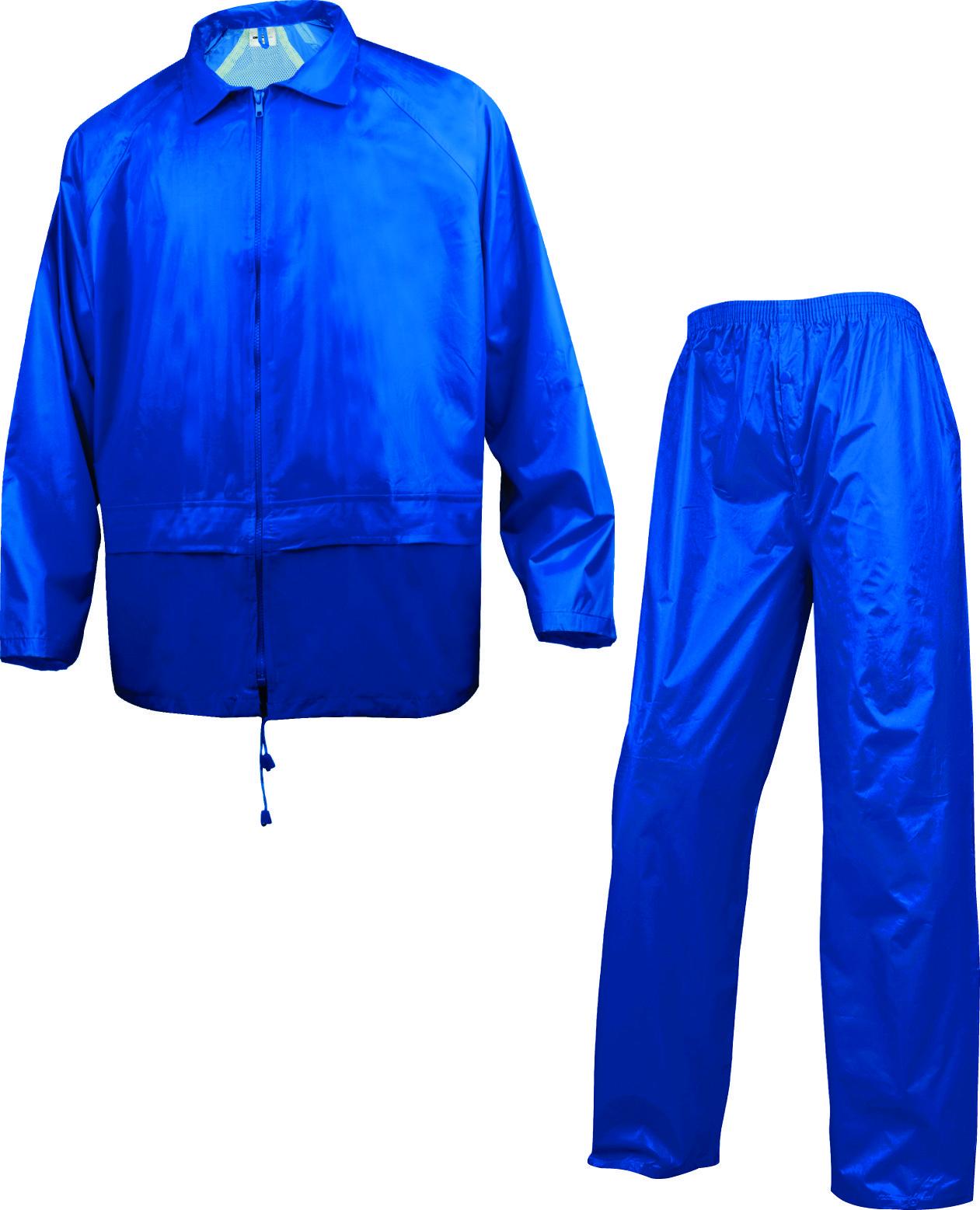 The Delta Plus designed rain jacket and trousers. Waterproof seams. Fastening with zip under storm flap. Fixed hood. Raglan sleeves. Adjustable cuffs with press-studs. 2 pockets. Elasticated waist. Adjustable bottom of legs with press-studs. 2 hand slits. PVC-coated polyester fabric