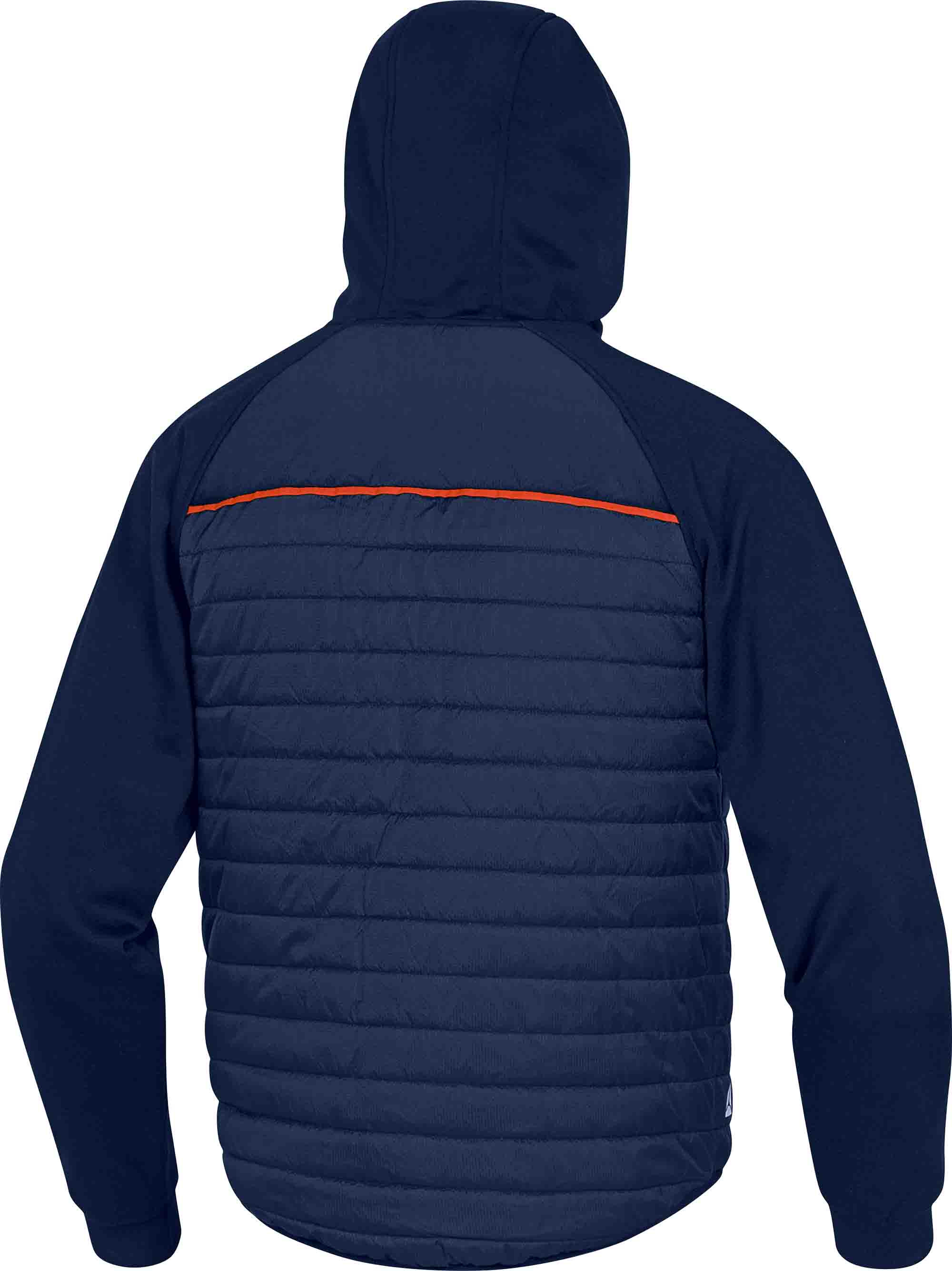 The Delta Plus Bi-material jacket. Fastening zip under storm flap. Fixed hood. Knitted cuffs. 5 pockets. Quilted polyurethane-coated Ripstop polyamide fabric. 2 laminated layers Polyester taffeta lining