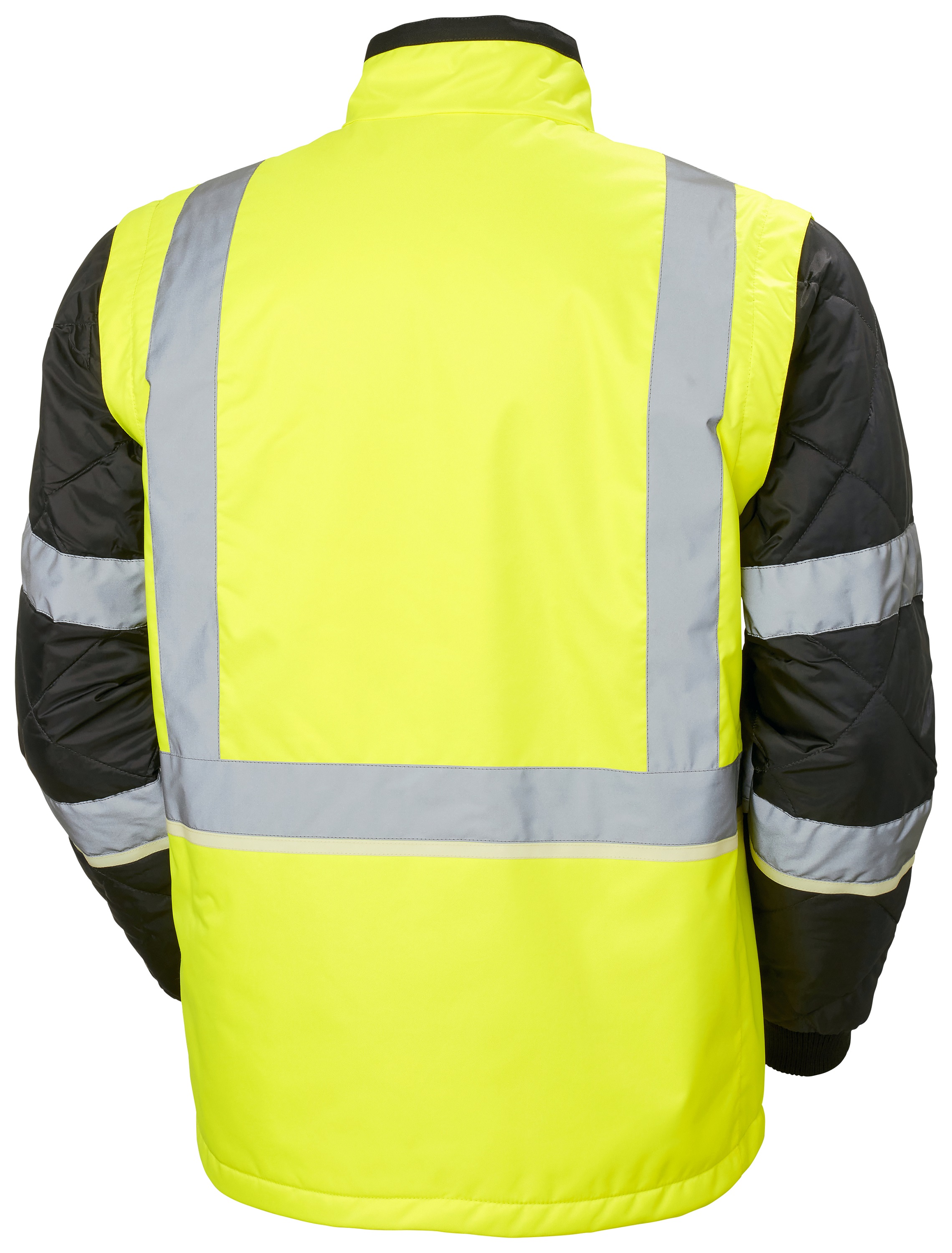 UC-ME Hi Vis Yellow Insulator Jacket with VizLite Phosphorescent Technology UC-ME is the latest addition to the hi vis line of Helly Hansen Workwear. Focusing on lightweight fabrics, necessary features and safety – UC-ME is the perfect choice for the end user wanting comfort, simplicity and superior visibility. UC-ME utilizes VizLite which is a phosphorescent technology that absorbs UV light energy from natural or artificial light which is then emitted as an afterglow in low light or no light conditions. Perfect for dark environments with little to no ambient light. Features and Benefits EN ISO 20471:2013 Class 2. EN 342:2017 Icler 0,304 m²K/W(B)(1,96 clo). EN 342:2017 in combination with style 71455 & 71456. EN 342:2017 Icler 0,326 m²K/W(B)(2,10 clo). EN 342:2017 in combination with style 71455, 71456 & 71185. EN 342:2017 air permeability Class 3. Brushed polyester inside collar. YKK® front zipper with chin protector. Hand pockets with YKK® zipper. Embellishment zipper. Zip-off sleeves. Elastic cuffs. Adjustable hem with elastic drawcord inside hand pocket. ID card loop. Extended back for improved comfort. Zip in compatible with 71185 UC-ME Shell Jacket The Helly Hansen UC-ME insulator jacket available in yellow colour. It has hand pockets with embellishment zipper. Also contains Zip off sleeves for optimal mobility and extended back for improved comfort. YKK® front zipper with chin protector Adjustable hem with elastic drawcord inside hand pocket ID card loop Brushed polyester inside collar