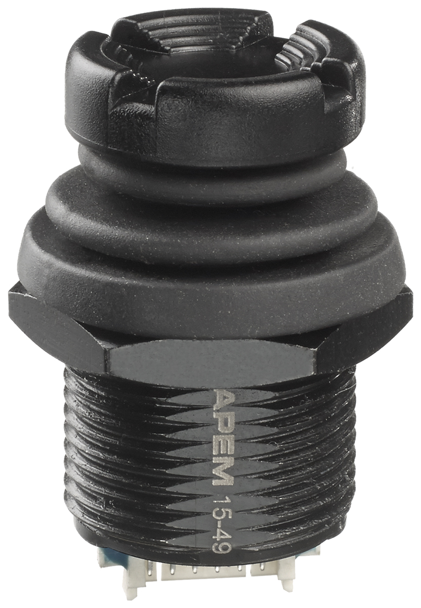 This is IP67 IP69K Thumbstick 3 axes 50 mA 6-Pin Connector 12V dc 6PST -45 → +65°C manufactured by APEM. The manufacturer part number is NVH1D1C1CP2S. The integrated contact has 12v dc of voltage rating. Additionally, it has about 12° (all directions) joystick travel capacity . Its handle height is approximately 13.1mm . Basically, this handle is a type of castle, allowing extreme comfort. The rated contact current is 50 ma. It is IP rated with ip67, ip69k. It is designed having 3 axes. Typical depth of 17.5mm behind panel. Whereas, the minimum operating temperature of the product is -40°c. The contact is equipped with 6pst configuration. The product has -45 → +65°c of operating temperature range. It is created using momentary switch technology . It has a maximum operating temperature of +65°c. The terminal is a 6-pin connector type.