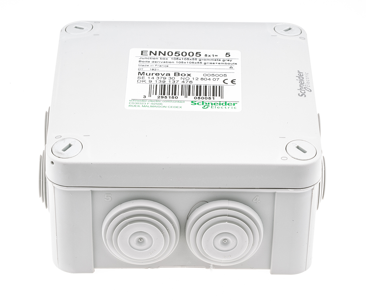 This is Polypropylene IP55 Junction Box Grey manufactured by Schneider Electric. The manufacturer part number is ENN05005. Its diameter is 20 mm. Is it a better world product? yes. It comprises 7 ways. It is IP rated with ip55. The product mureva, is a highly preferred choice for users. It has a decent grey colour. The product is made from highly stable and reliable polypropylene. In addition, the height is 105mm. The product is certified with no hazardous area certification. Furthermore, the product is 105 mm wide. It features mureva range. junction box is a versatile product designed to provide user-defined applications.