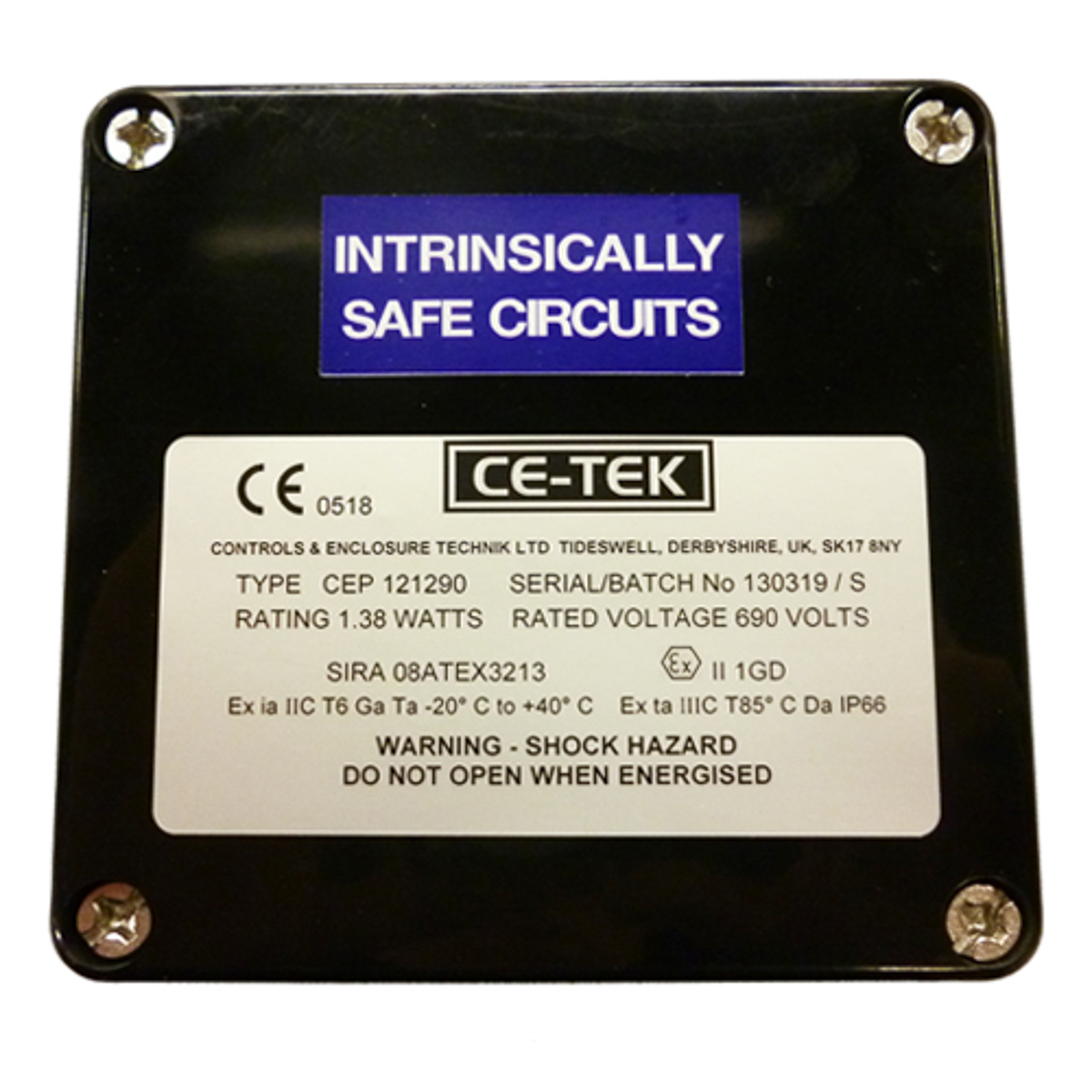 This is GRP EX"ia" IP66 Junction Box122x120x90m manufactured by CE-TEK. The manufacturer part number is CEP121290PAI. It has about 120 x 122 x 90mm dimensions L x W x H . It is IP rated with ip66. The product cep, is a highly preferred choice for users. It has a decent black colour. The product is made from highly stable and reliable polyester. Moreover, it has a typical 4 x m20 cable entry . In addition, the height is 122mm. The product is certified with atex hazardous area certification. Furthermore, the product is 90mm wide. Its accurate length is 120mm. It includes 10 dedicated terminals .