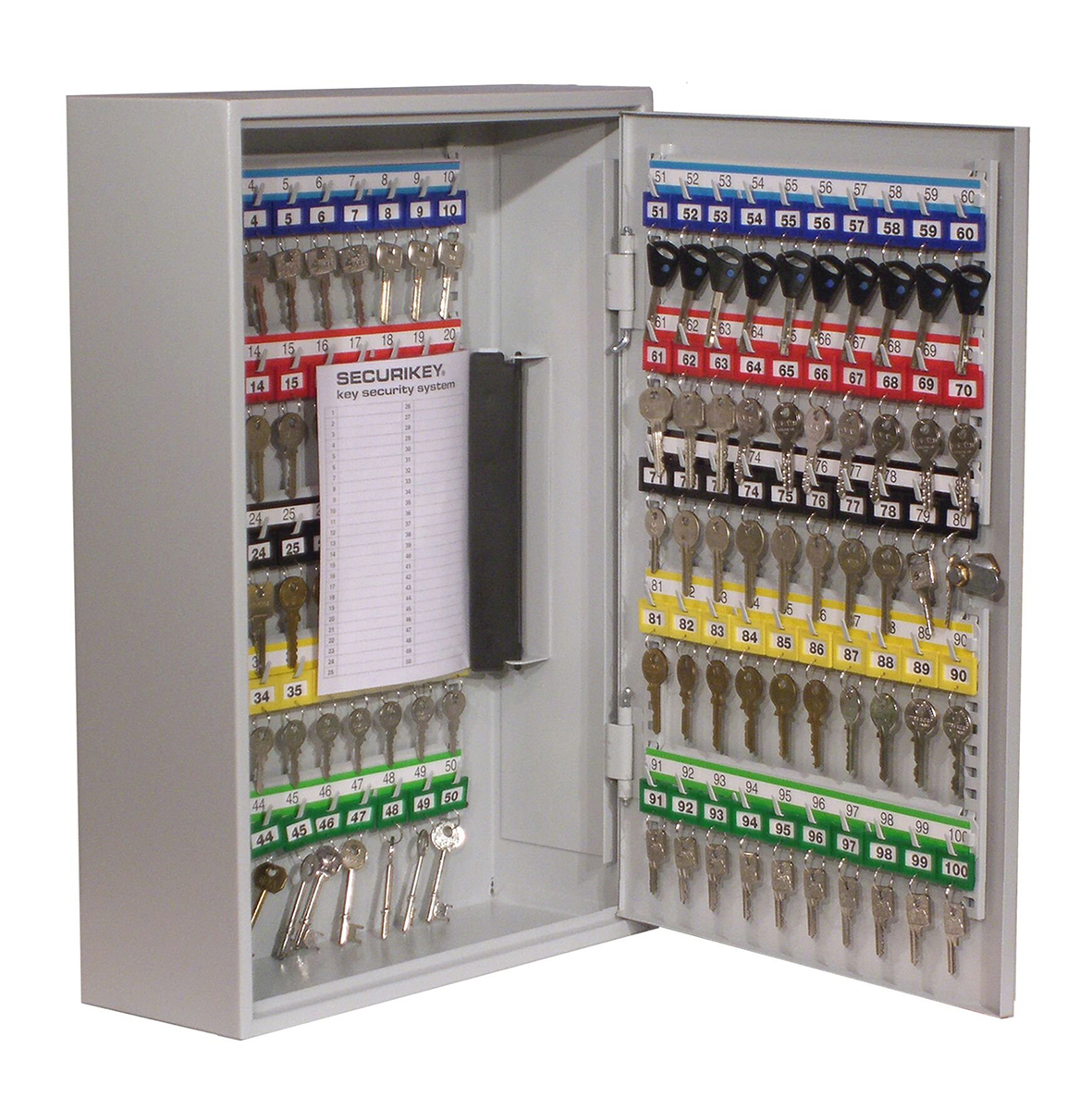 This is Key Cabinet for 100 Keys manufactured by Securikey. The manufacturer part number is KD100. The module has the capacity of 100. The product is available in wall mounted configuration. It has a decent grey colour. The product is made from highly stable and reliable steel. It has a/an key cabinet type cabinet . In addition, the height is 550 mm. Furthermore, the product is 380mm wide. The product comes in 140 mm depth. It has a key lock access type cabinet .