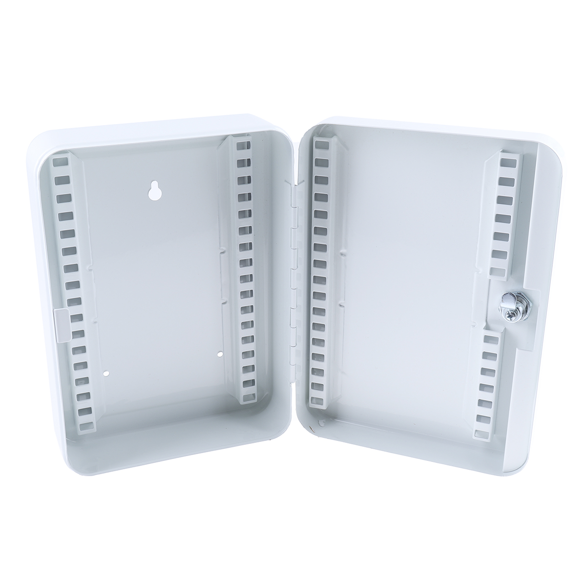 This is Key Cabinet for 20 Keys manufactured by Rottner Comsafe. The manufacturer part number is T03122. The module has the capacity of 20. The product is available in wall mounted configuration. It has a decent grey colour. The product is made from highly stable and reliable steel. It has a/an key cabinet type cabinet . In addition, the height is 250 mm. Furthermore, the product is 185mm wide. The product comes in 85 mm depth. It has a key lock access type cabinet .