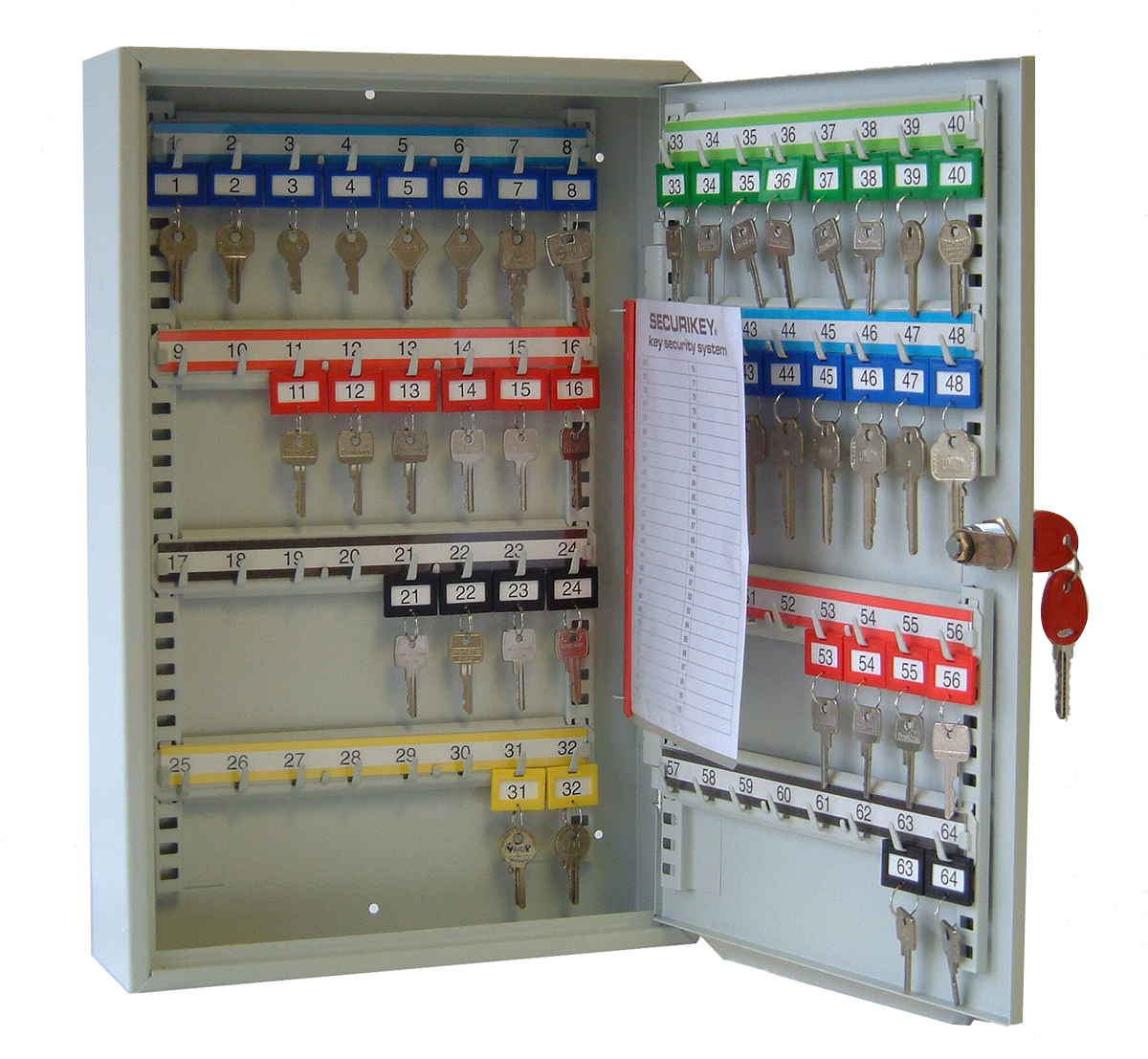 This is Key Cabinet for 64 Keys manufactured by Securikey. The manufacturer part number is KC064. The module has the capacity of 64. The product is available in wall mounted configuration. It has a decent grey colour. The product is made from highly stable and reliable steel. It has a/an key cabinet type cabinet . In addition, the height is 450 mm. Furthermore, the product is 300mm wide. The product comes in 80 mm depth. It has a key lock access type cabinet .