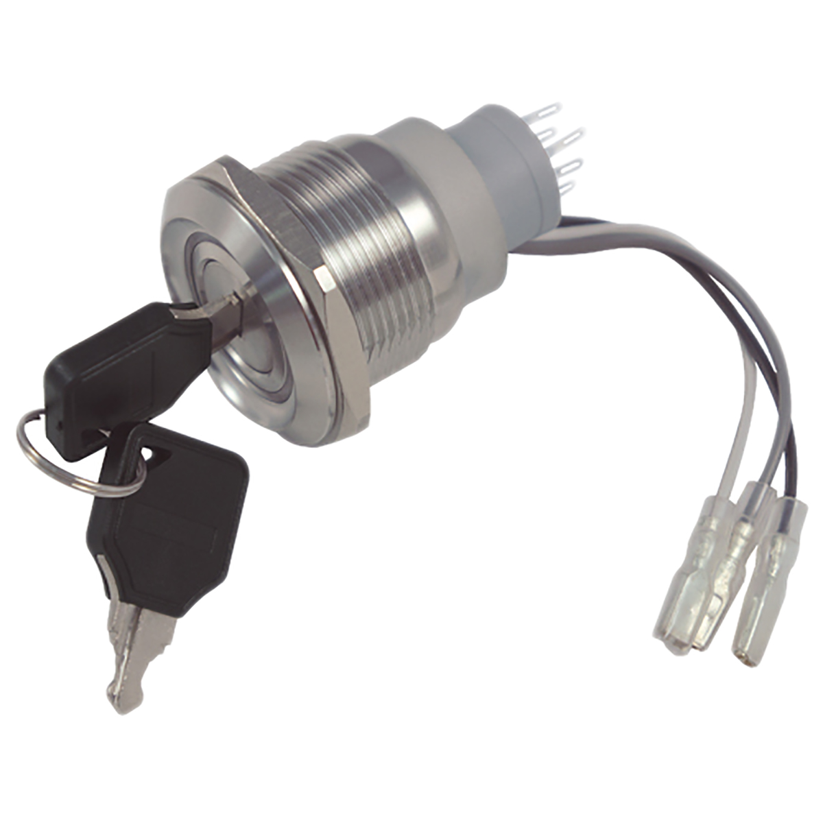 This is IP40 Key Switch DPDT 5 A 2-Way -20 → +55°C manufactured by RS Pro. The manufacturer part number is 877-1882. The product has a standard 250v AC voltage rating . Its key index is of 90° angle . The product complies with all safety standards, such as ce, cul, ul. The product has -20 → +55°c of operating temperature range. It is IP rated with ip40. The rated contact current is 5 a. The contact is equipped with dpdt configuration. It has a 30v DC voltage rating . The product carries possible position value of 2. Typical depth of 48.5mm behind panel. The casing is constructed from highly stable stainless steel material. It has a round shape bezel . Whereas, the minimum operating temperature of the product is -20°c. The product also provide mechanical stability with 50000operations. It provides latching switch operation. It has a maximum operating temperature of +55°c. The terminal is a solder type. The product is made from sturdy silver materials.