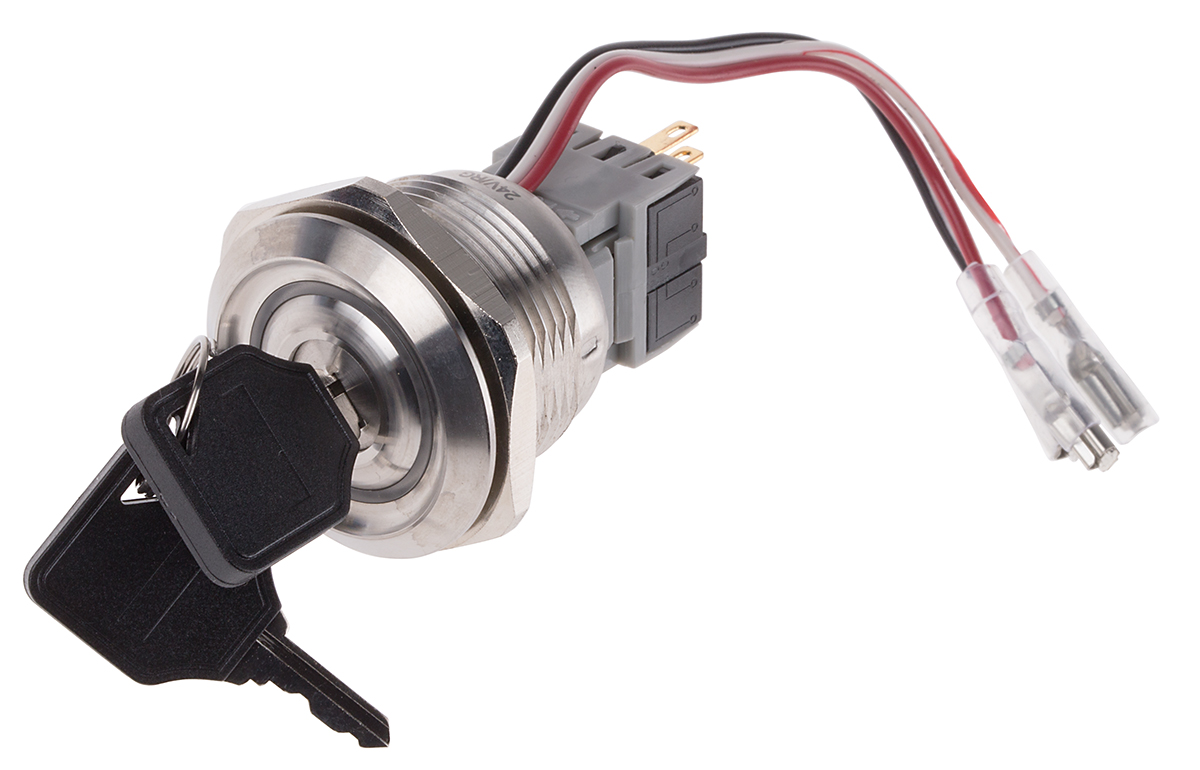 This is IP40 Key Switch SPDT 5 A 2-Way -20 → +55°C manufactured by RS Pro. The manufacturer part number is 877-1909. The product has a standard 250v AC voltage rating . Its key index is of 90° angle . The product complies with all safety standards, such as ce, cul, ul. The product has -20 → +55°c of operating temperature range. It is IP rated with ip40. The rated contact current is 5 a. Key trapping included no . The contact is equipped with spdt configuration. It has a 30v DC voltage rating . The product carries possible position value of 2. Typical depth of 52mm behind panel. The casing is constructed from highly stable stainless steel material. It has a round shape bezel . Whereas, the minimum operating temperature of the product is -20°c. The product also provide mechanical stability with 50000operations. It provides latching switch operation. It has a maximum operating temperature of +55°c. The terminal is a solder type. The product is made from sturdy silver materials.