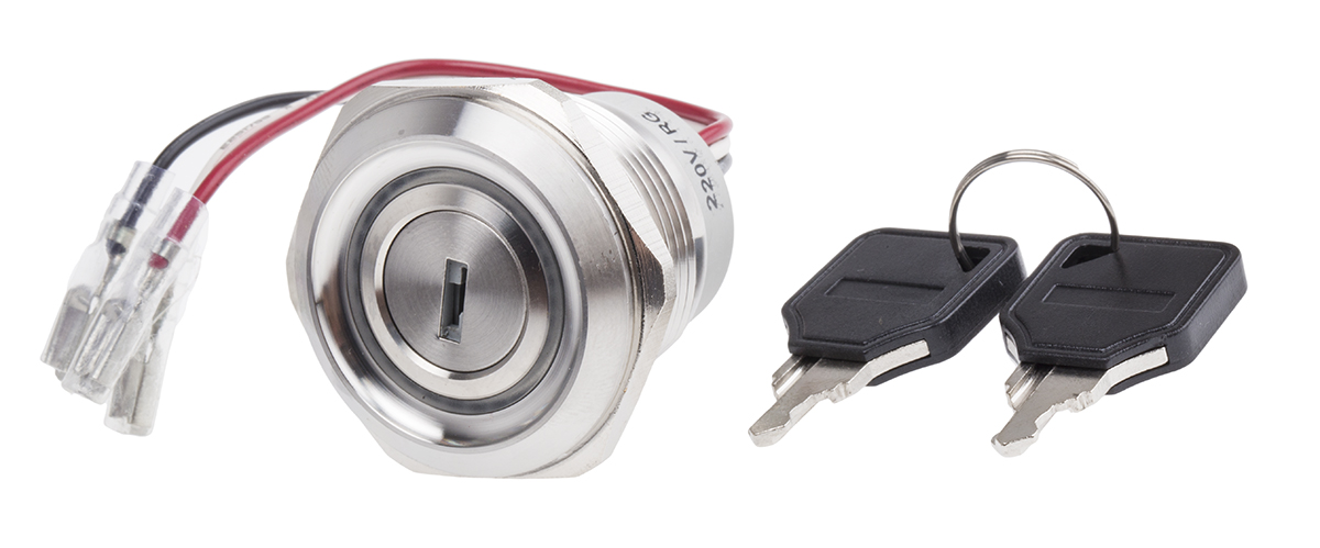 This is IP40 Key Switch SPDT 5 A 2-Way -20 → +55°C manufactured by RS Pro. The manufacturer part number is 877-1889. The product has a standard 250v AC voltage rating . Its key index is of 90° angle . The product complies with all safety standards, such as ce, cul, ul. The product has -20 → +55°c of operating temperature range. It is IP rated with ip40. The rated contact current is 5 a. Key trapping included no . The contact is equipped with spdt configuration. It has a 30v DC voltage rating . The product carries possible position value of 2. Typical depth of 37mm behind panel. The casing is constructed from highly stable stainless steel material. It has a round shape bezel . Whereas, the minimum operating temperature of the product is -20°c. The product also provide mechanical stability with 50000operations. It provides latching switch operation. It has a maximum operating temperature of +55°c. The terminal is a solder type. The product is made from sturdy silver materials.